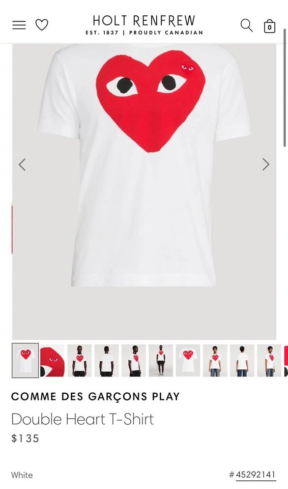Like new Comme des Garçons Double Heart T-Shirt. Amazing condition, size small. Retails for $135 plus tax at Holt Renfrew. Only $50!