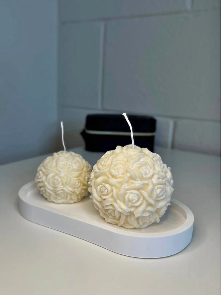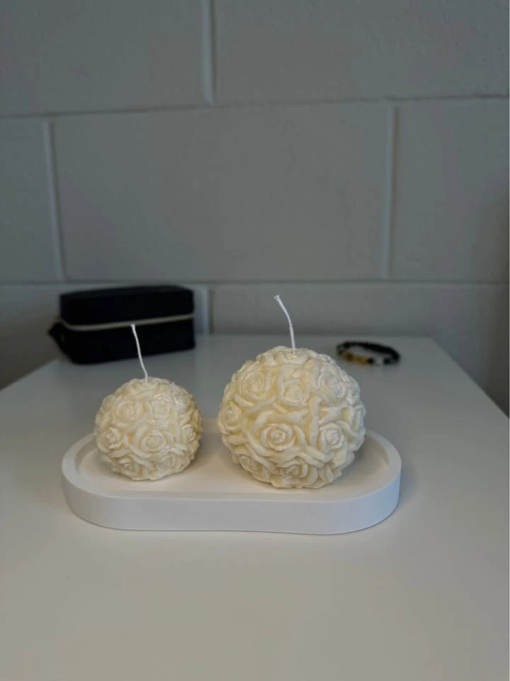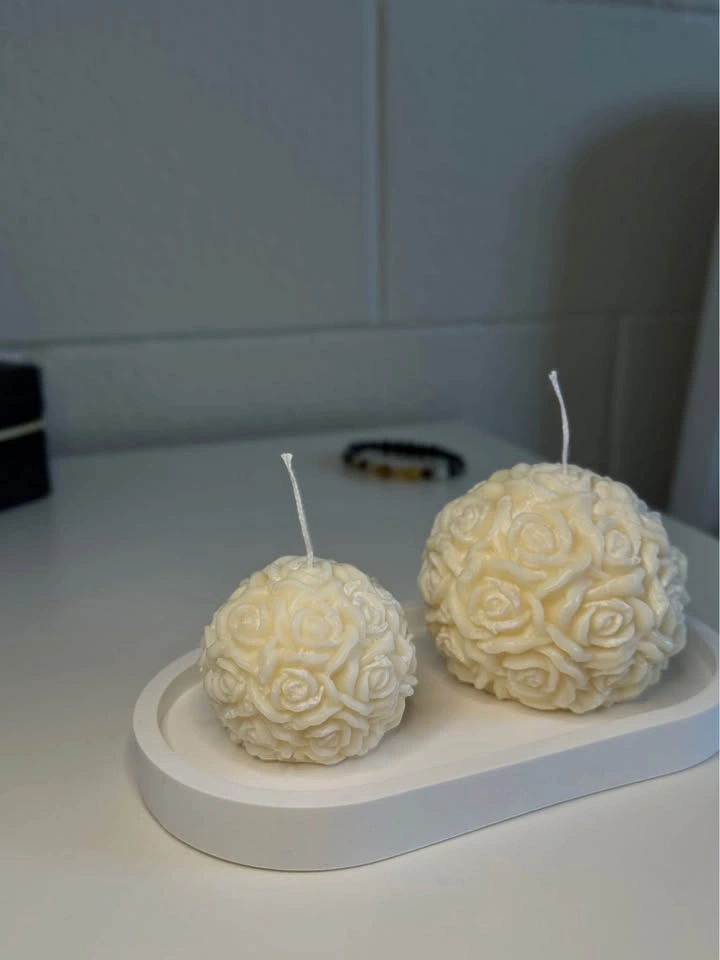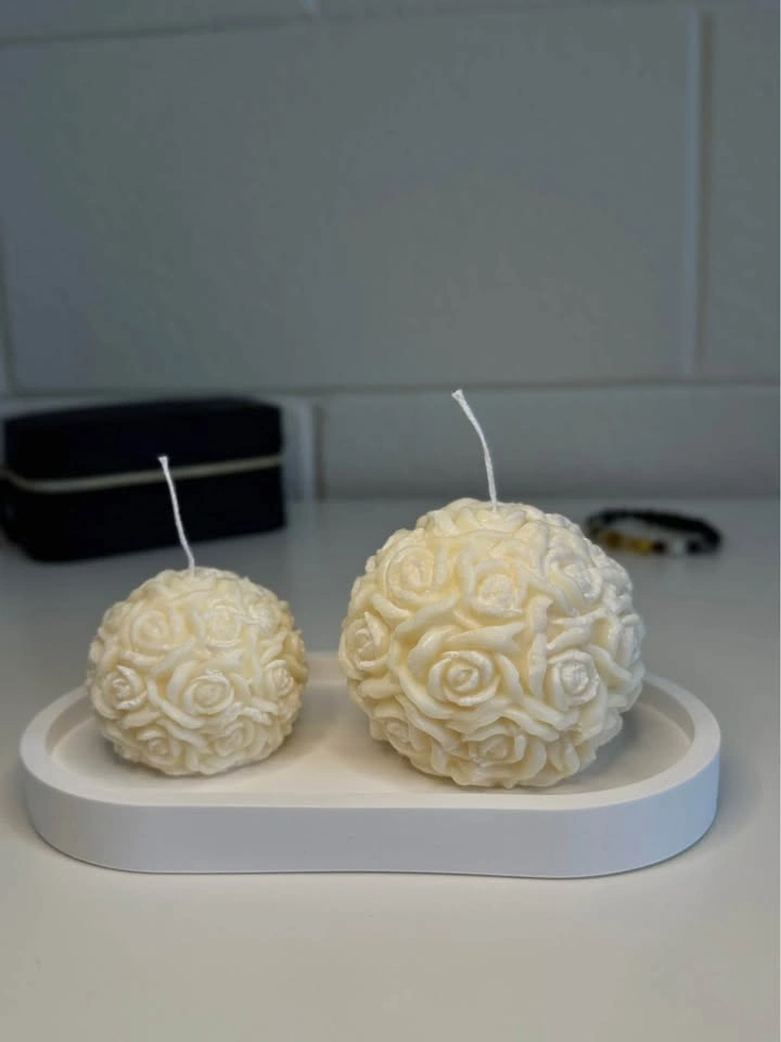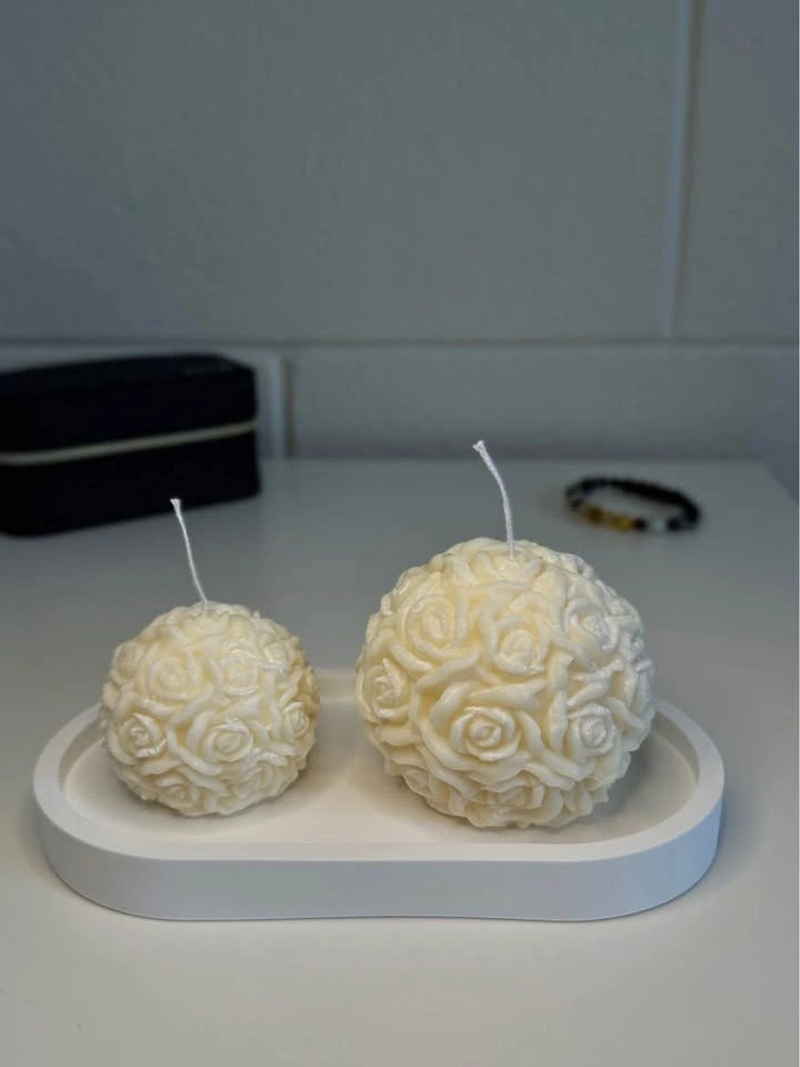 Bring elegance and romance into your home with this set of two rose ball candles with a minimalist tray Each candle is carefully handcrafted from natural soy wax and detailed with blooming roses, creating the look of a luxurious bouquet. The included tray makes this set ready to display or gift — a perfect choice for home decor or a thoughtful present. ✨ Details: • Includes: 2 rose ball candles (different sizes) + 1 decorative tray • Material: 100% natural soy wax (candles), eco-resin tray • Color: Creamy white (neutral & elegant) • Sizes: Large ~9 cm, Small ~7 cm diameter • Burn time: 8–12 hours (each, depending on conditions) • Eco-friendly & non-toxic 🎁 Perfect for: • Romantic home decor & cozy evenings • Wedding favors or bridal shower gifts • Birthday, Valentine’s Day, or anniversary gifts • Unique centerpiece for dining tables Each set is lovingly handcrafted, so every piece is unique and special. Ready to gift straight out of the box.