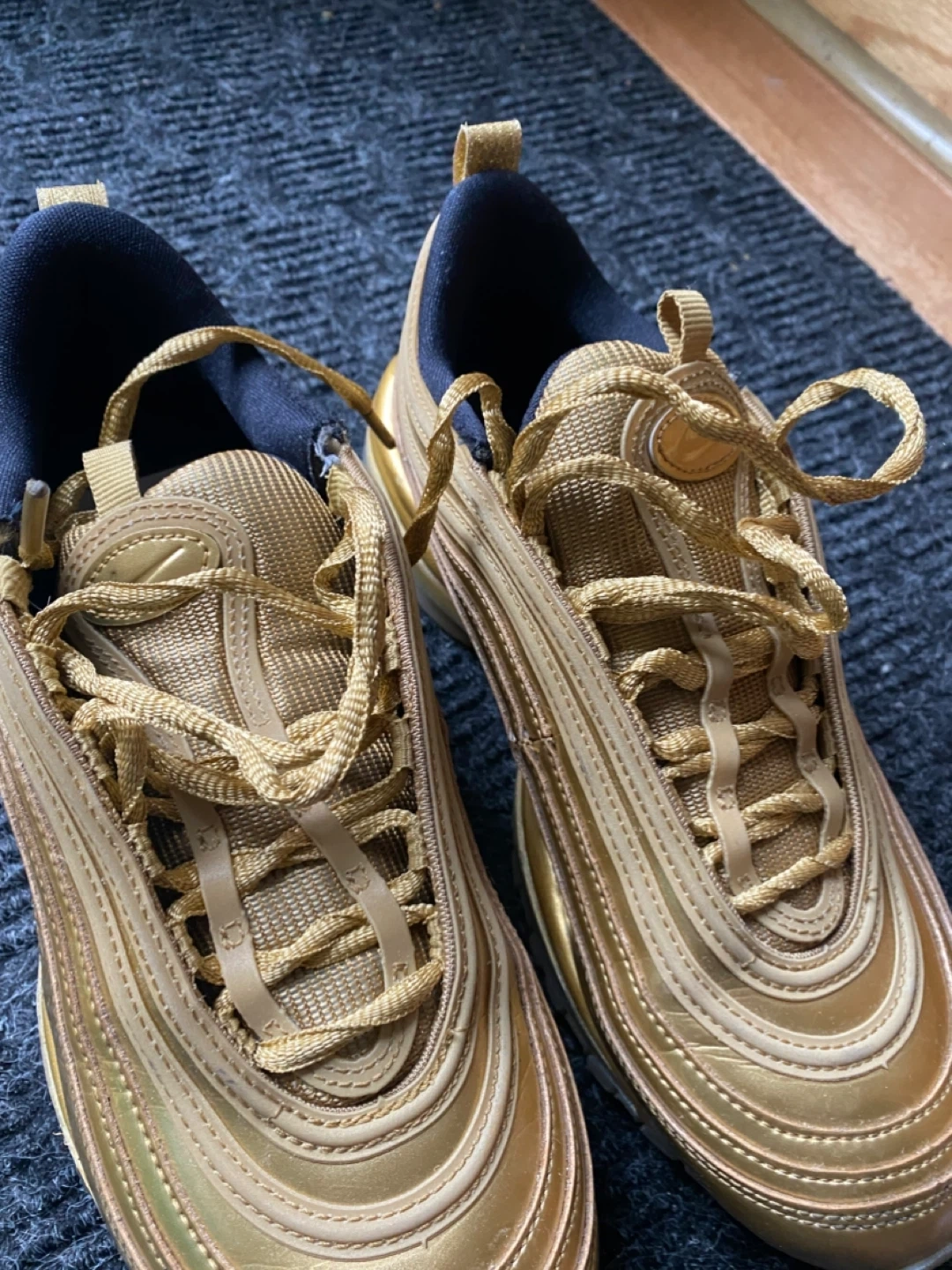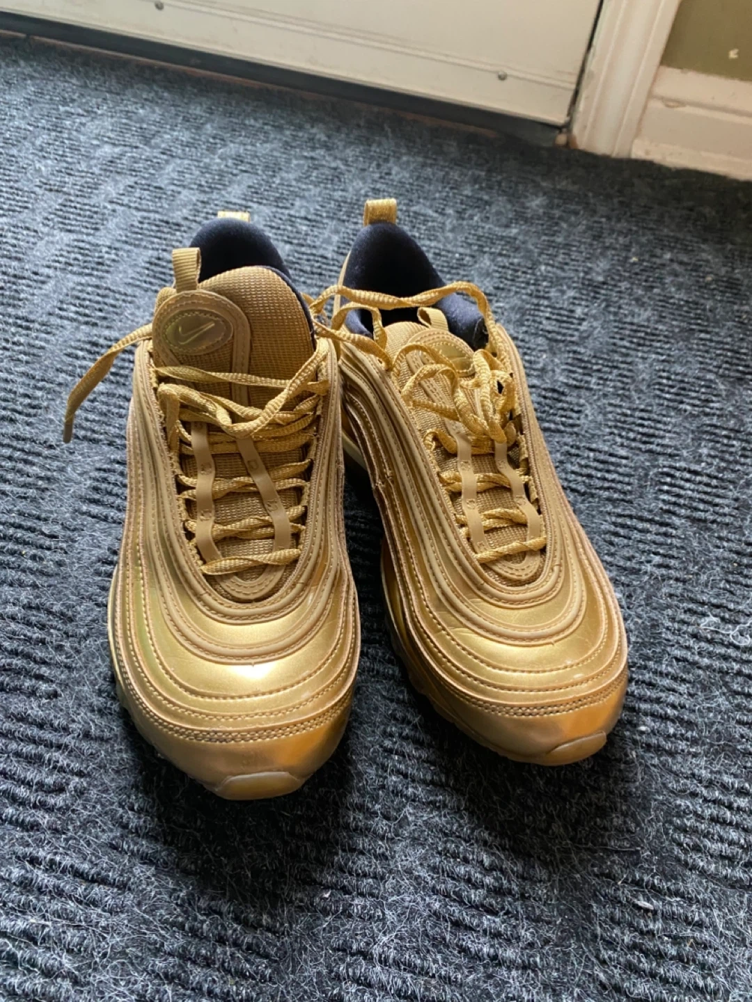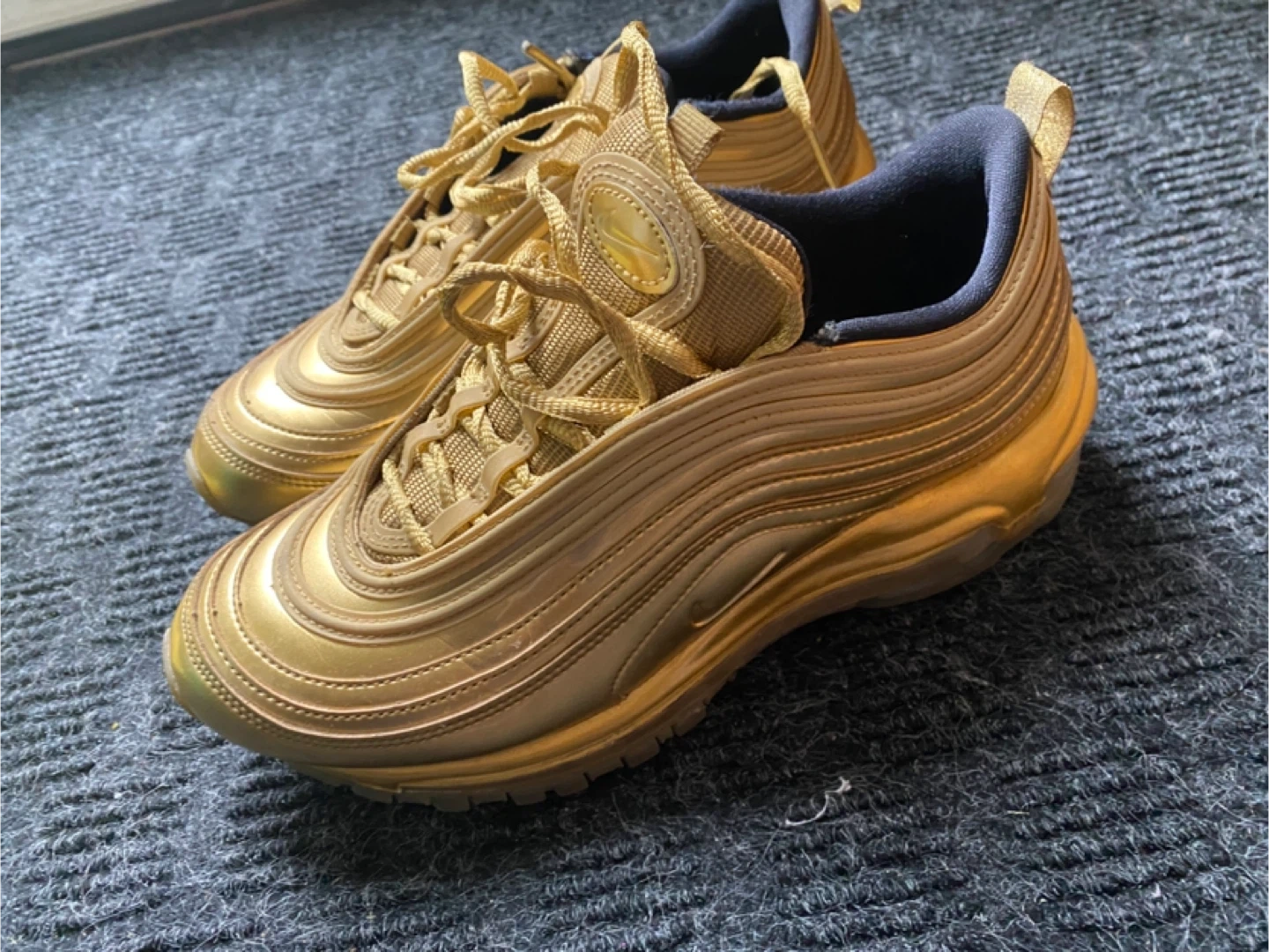 Selling a pair of Nike Air Max 97 in gold, size US 6. They are in good condition, perfect for adding some shine to your step!