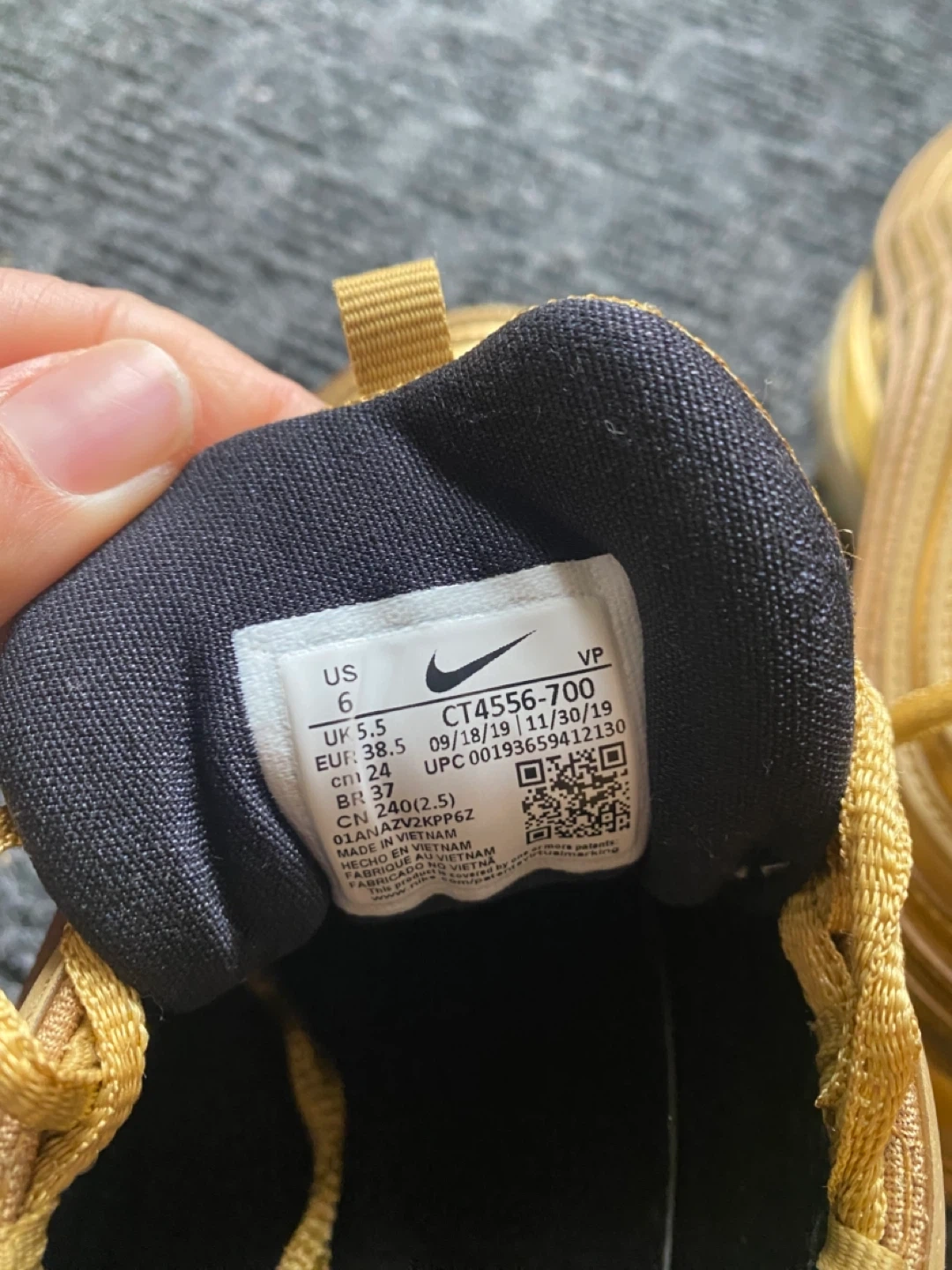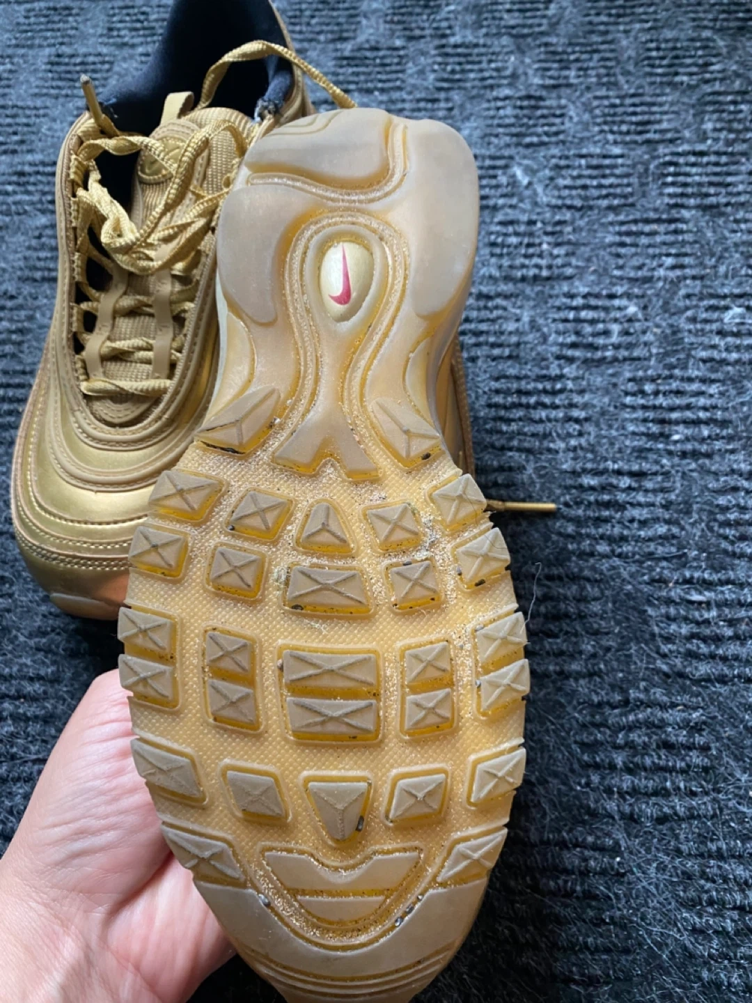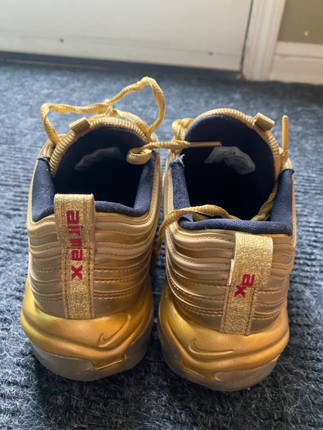 Selling a pair of Nike Air Max 97 in gold, size US 6. They are in good condition, perfect for adding some shine to your step!