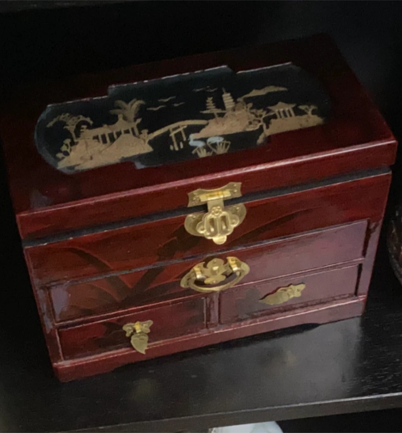 A lovely wooden jewelry box with multiple drawers, perfect for organizing your precious items! The box features a unique design on the top and brass-coloured hardware that adds a touch of elegance to any room