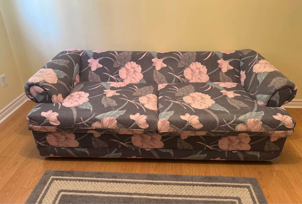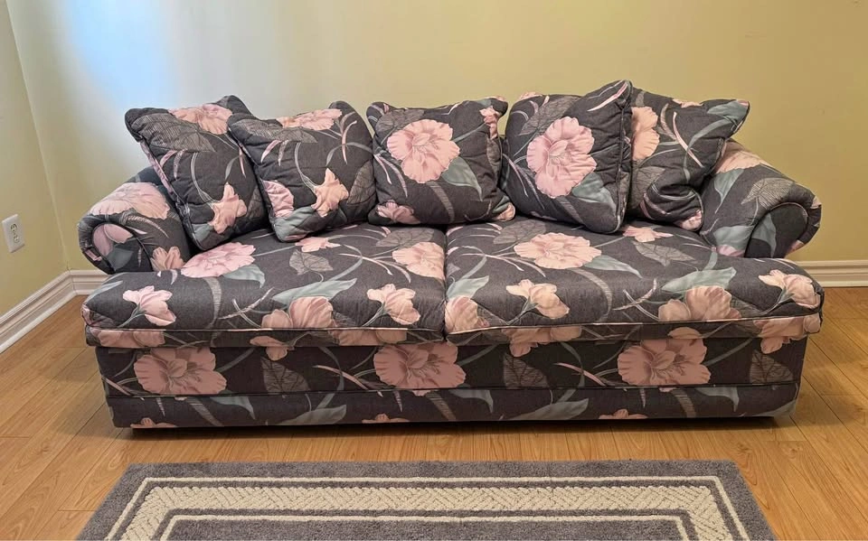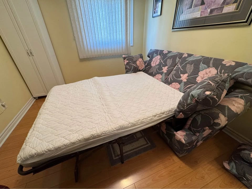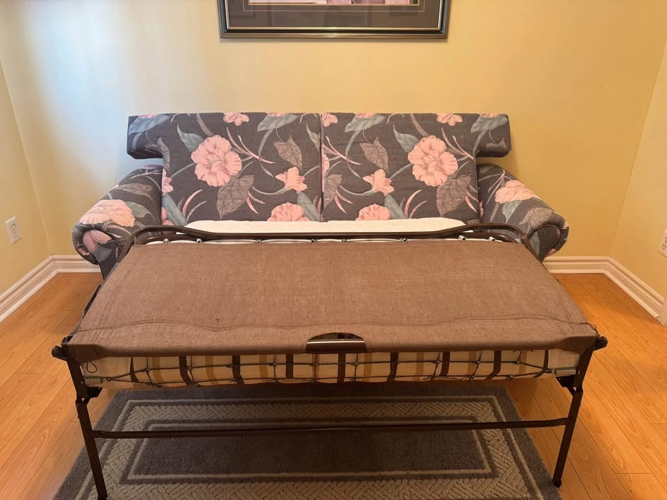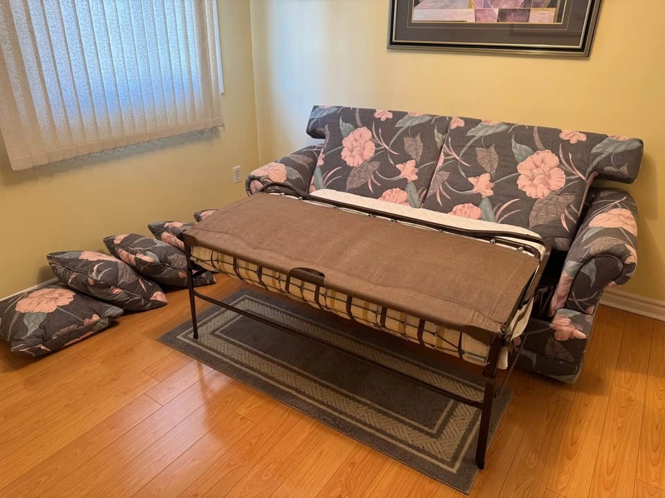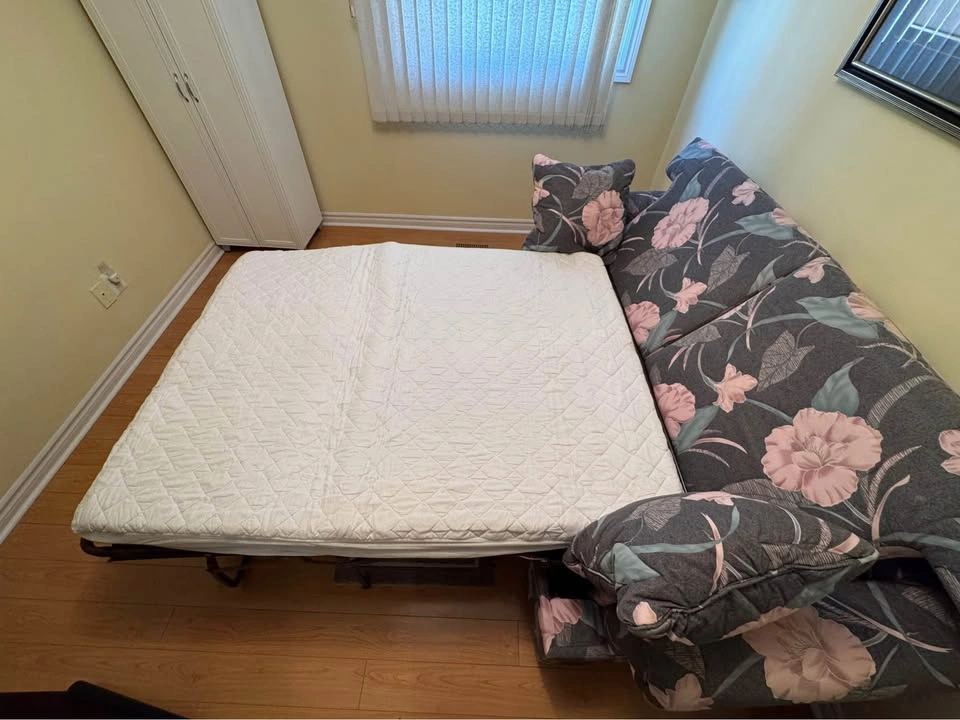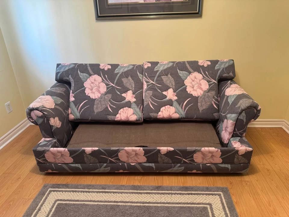 Floral pull-out sofa bed with a comfy double mattress (53″ × 70″) and bonus memory foam pad. Sofa size 80″ wide. Great for guests or small spaces. PICKUP ONLY CASH When inquiring please confirm that you have a way to pick it up (right size vehicle) and will be coming with help to carry it down