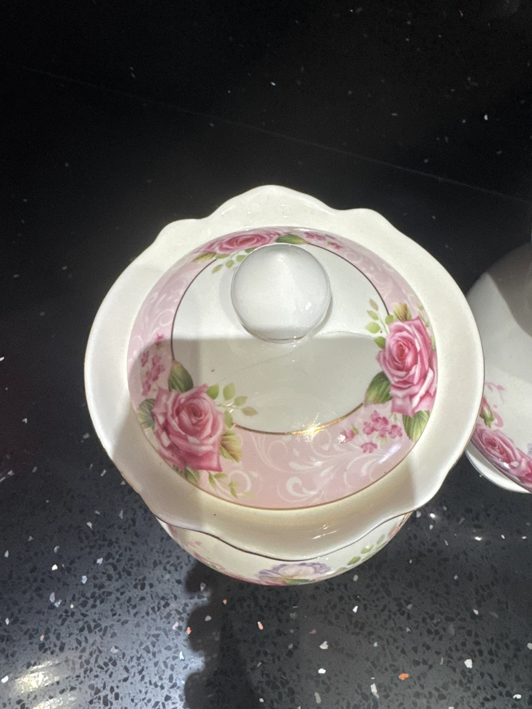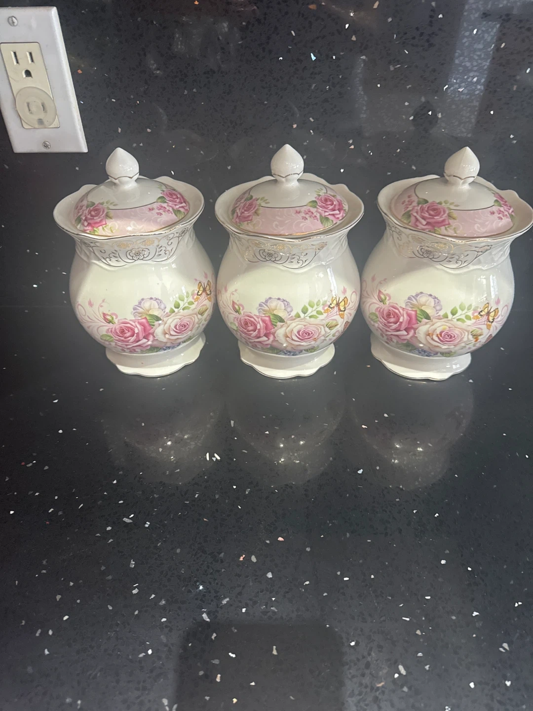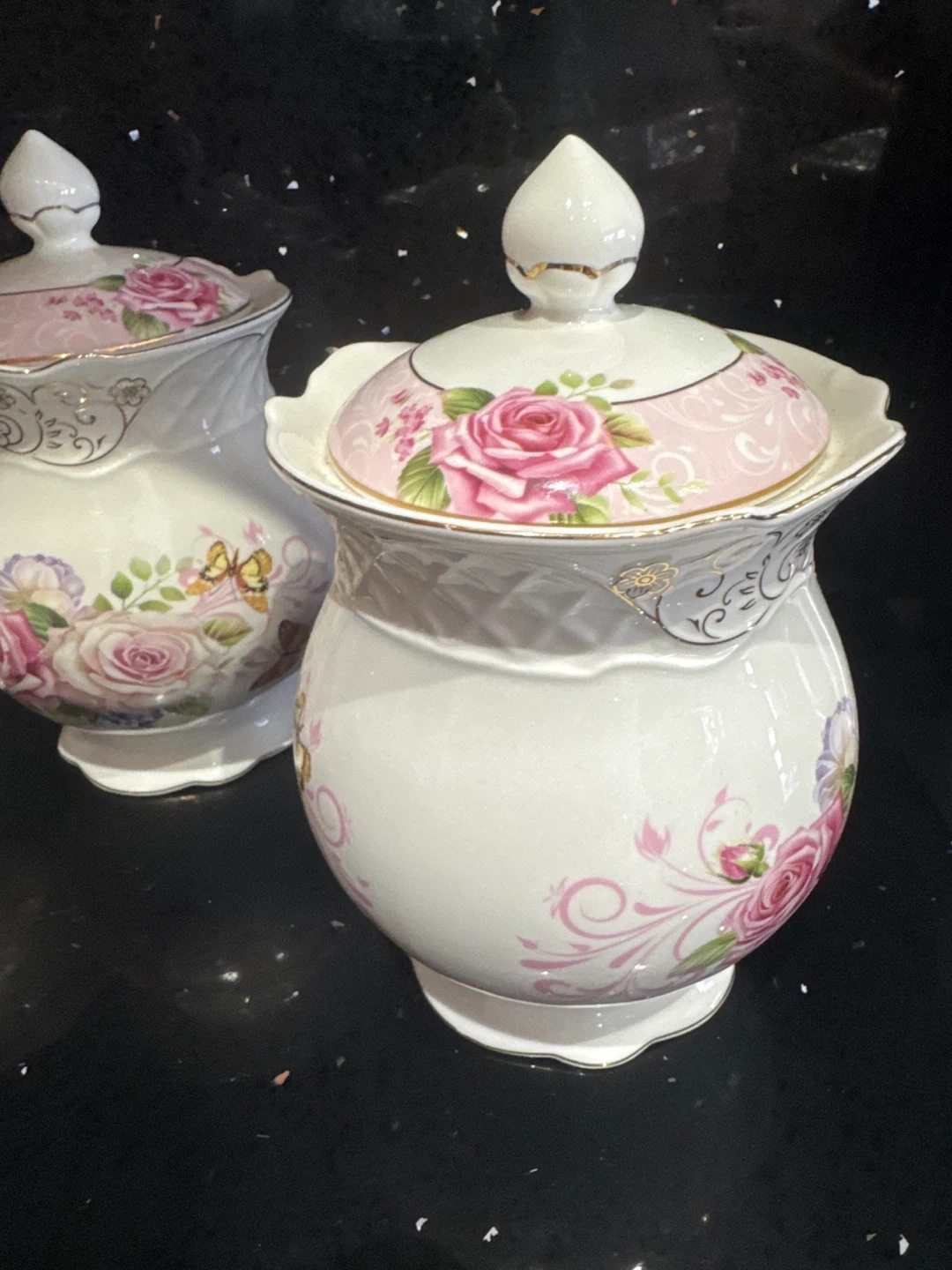 Selling a set of vintage sugar bowls, each with a matching lid. They feature a delicate floral design with roses and butterflies. Perfect for adding a touch of elegance to your tea time or kitchen decor!