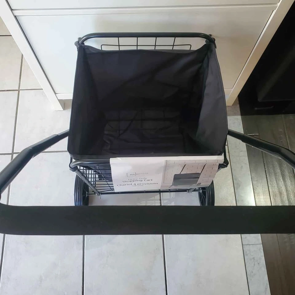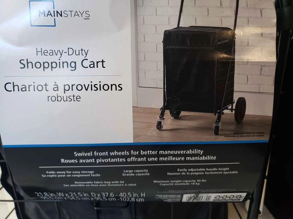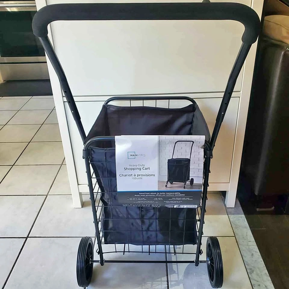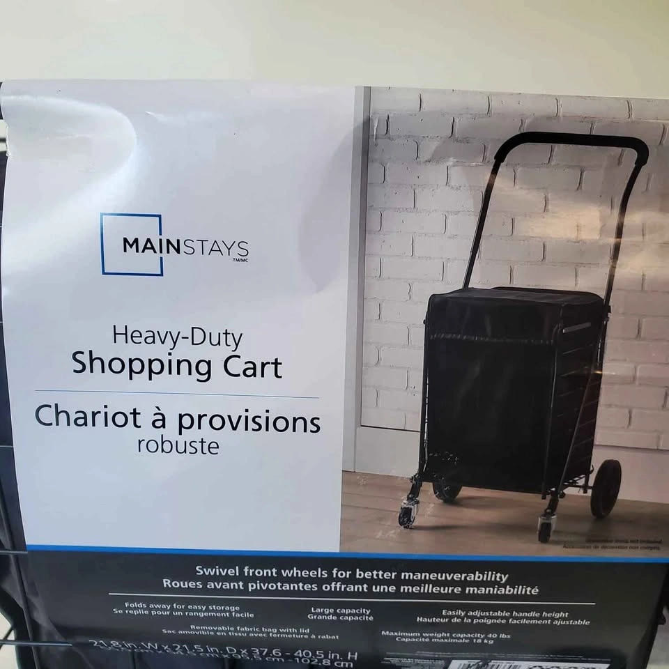 This Mainstays adjustable height heavy-duty shopping cart features swivel front wheels for better maneuverability and a large capacity removable fabric bag with lid. It's in new condition, and ready to help you tackle your shopping trips with ease. When not in use, it folds away for easy storage. Specifications: * Swivel front wheels * Large capacity * Removable weatherproof bag with lid * Folds away for easy storage * Adjustable handle height * Maximum weight capacity 40 lbs