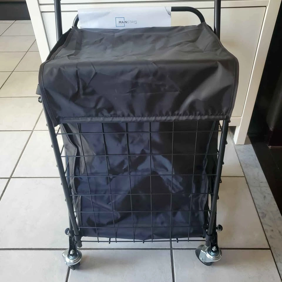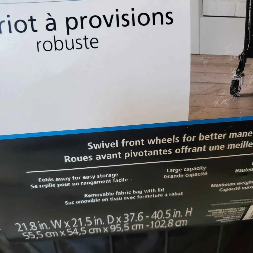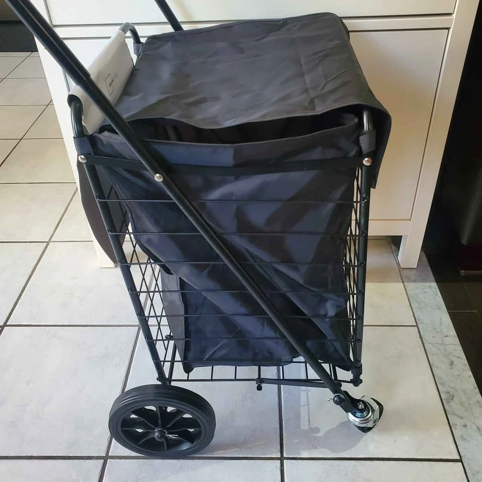 This Mainstays adjustable height heavy-duty shopping cart features swivel front wheels for better maneuverability and a large capacity removable fabric bag with lid. It's in new condition, and ready to help you tackle your shopping trips with ease. When not in use, it folds away for easy storage. Specifications: * Swivel front wheels * Large capacity * Removable weatherproof bag with lid * Folds away for easy storage * Adjustable handle height * Maximum weight capacity 40 lbs