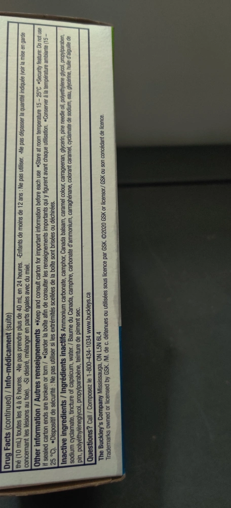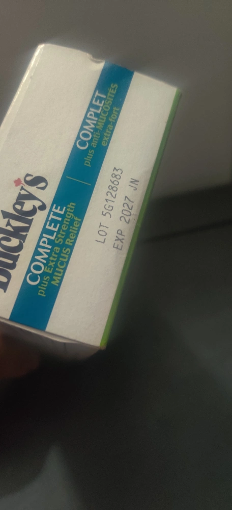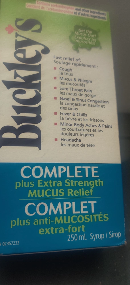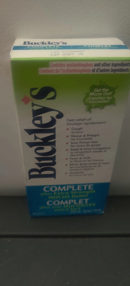 Buckley's COMPLETE plus Extra Strength Mucus Relief syrup, 250 mL. Expiry date is June 2027. Box is unopened