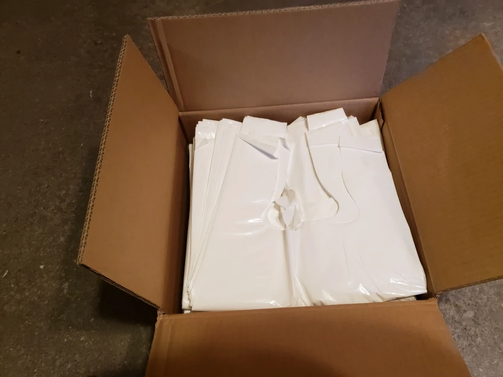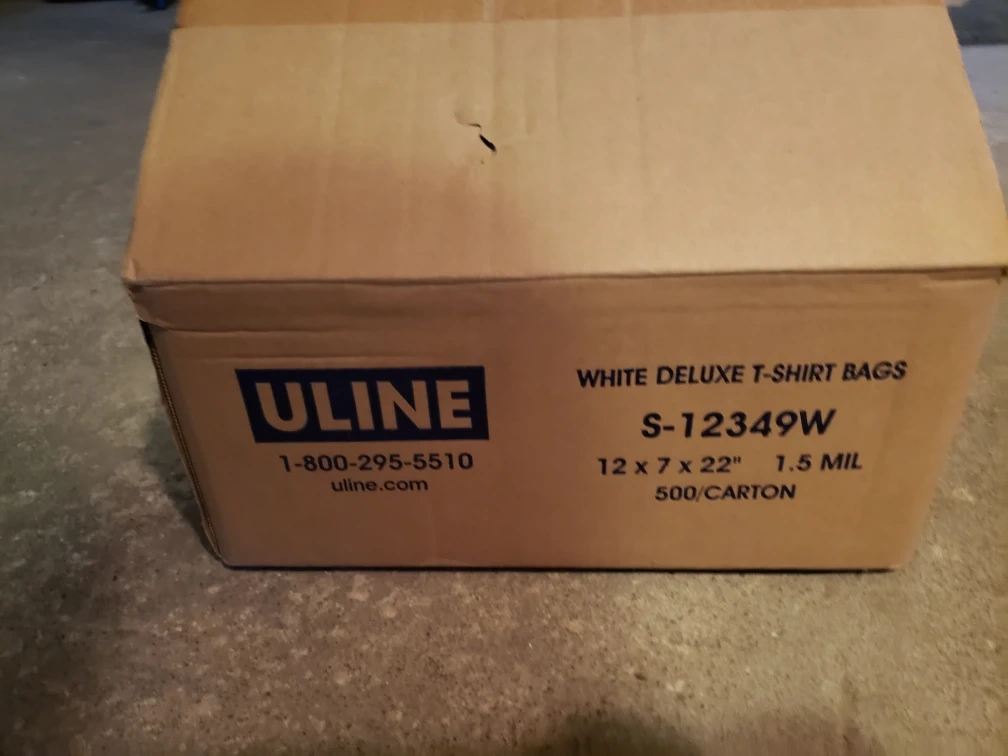 - Multiple boxes of Uline White Deluxe T-Shirt Bags for sale. 500 bags per box.