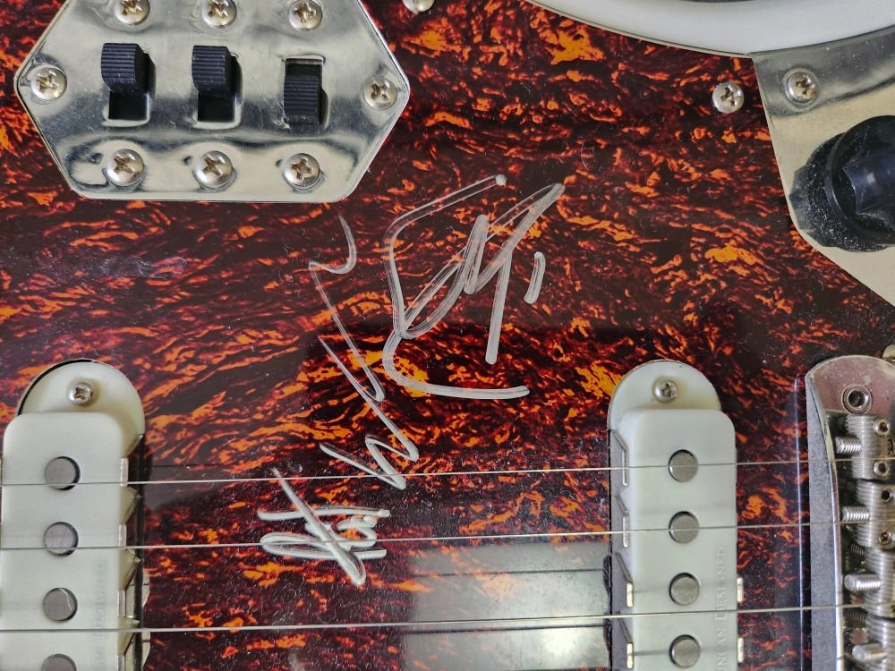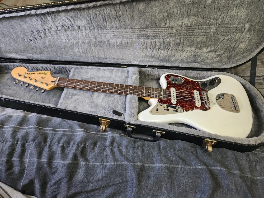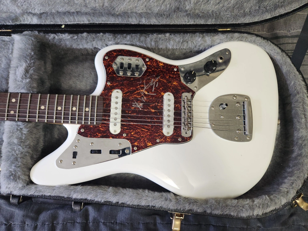 Selling a Squier by Fender Vintage Modified Jaguar electric guitar. It's in great shape and comes with a hard case. Pickguard is autographed by Dave Grohl and Pat Smear of Foo Fighters / Nirvana / Germs but I have no proof the sinatures are real so price reflects that. Great shape. Like New. The guitar is olympic white with a tortoise shell pickguard. The serial number is ICS13024535. https://serialnumberlookup.fender.com/product/0302000505 Price Firm. Pick-up Only. Cash Only