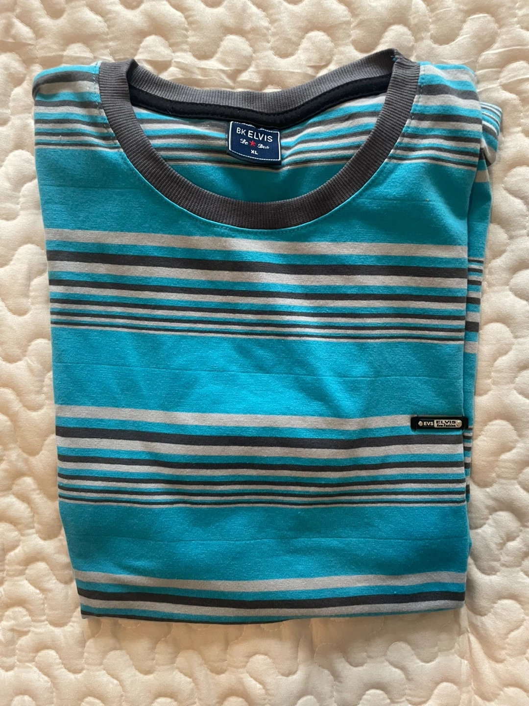 Selling a BK Elvis striped t-shirt in size XL. It features a stylish striped pattern with a grey collar. Perfect for casual wear! Fits more like a large