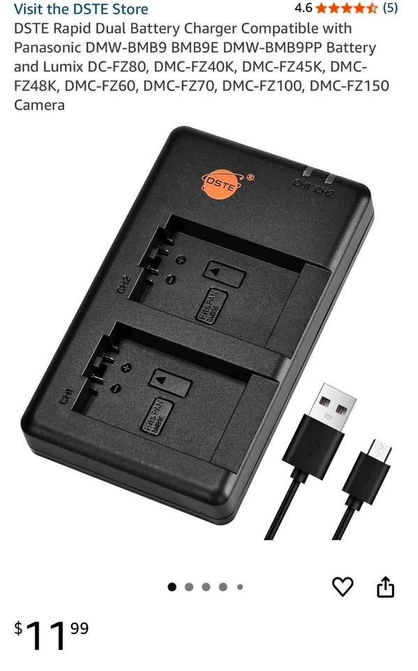 New DSTE Rapid Dual Battery Charger Compatible with Panasonic DMW-BMB9 BMB9E DMW-BMB9PP Battery and Lumix DC-FZ80, DMC-FZ40K, DMC-FZ45K, DMC-FZ48K, DMC-FZ60, DMC-FZ70, DMC-FZ100, DMC-FZ150 Camera. Retails for $11.99 on Amazon. Asking $5. Pickup near Danforth & Coxwell.