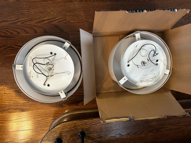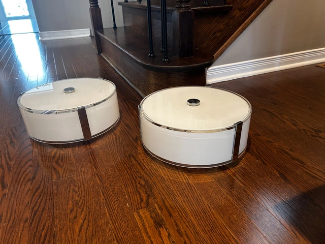 Add a touch of modern elegance to your home with these sleek flush mount ceiling lights! These lights feature a minimalist design with a white diffuser and chrome accents, perfect for any room in your house. These lights are in excellent condition. Has light bulbs included. * **Type:** Flush Mount Ceiling Light * **Style:** Modern * **Color:** White and Chrome * **Quantity:** 2 $25 each or 2 for $40 If the ad's still up, the lights are available!