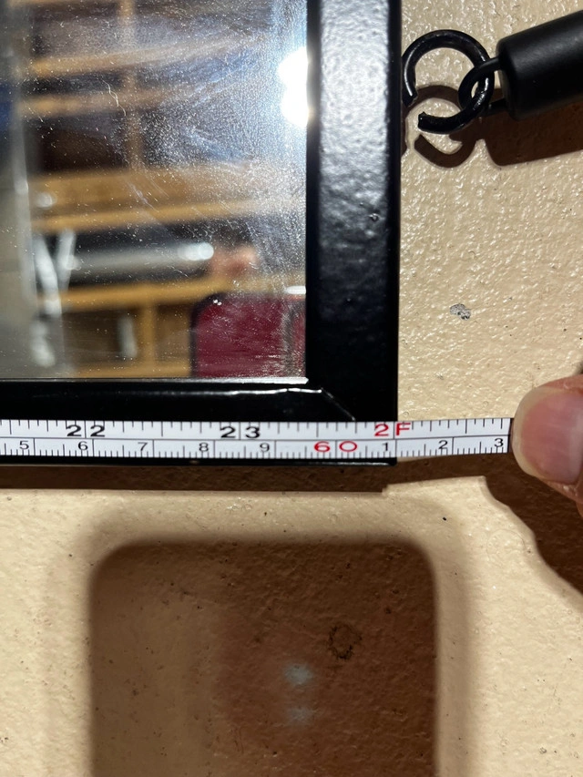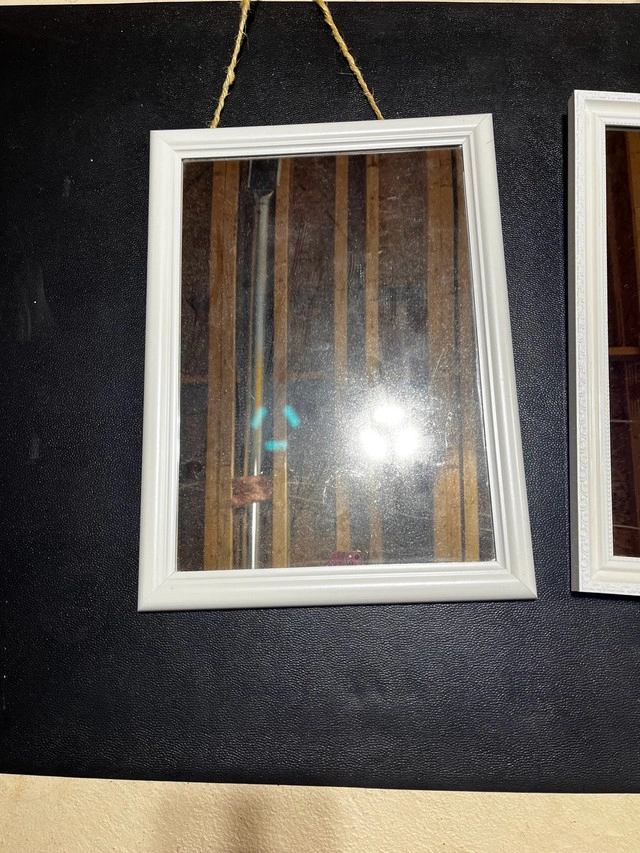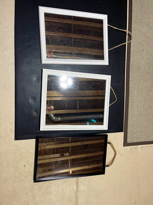 Set of 3 hanging mirrors. One black mirror with rope hanging, two white framed mirrors. All in good condition. $15 each - $30 if you take all three