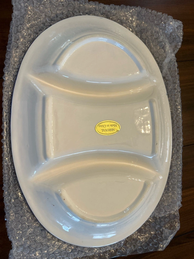 This never used is a beautiful, hand-painted Bordallo Pinheiro Majolica-style three-part serving dish featuring a vibrant blue background and charming orange fruit designs. It's perfect for serving appetizers, snacks, or condiments in style. While it's in used condition, it remains a stunning piece for any table setting. If the ad is still up, it's still available!