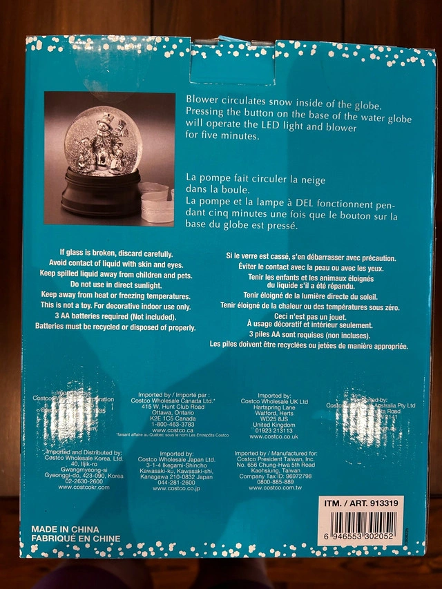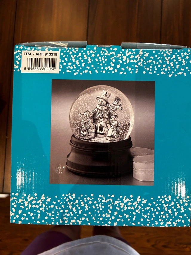 NEW - GIFTABLE never been opened Add a touch of winter wonderland to your home with this brand new water globe featuring snowmen, complete with blower and LED lights! This charming snow globe creates a festive atmosphere with its swirling snow and cheerful illumination. * Blower Circulates Snow Inside the Globe * LED Lights * Requires 3 AA batteries (not included) This snow globe would make a fantastic addition to your holiday decor! If the ad is up, it's available!