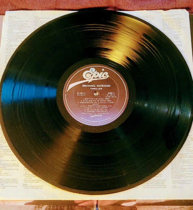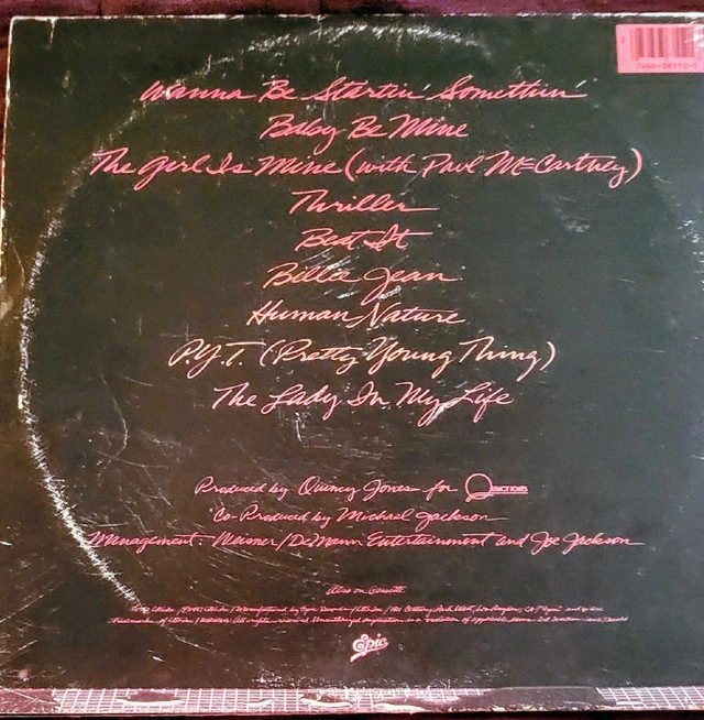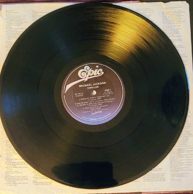 Selling a Michael Jackson Thriller first edition record from 1982, a true piece of music history! This album has been well-loved but remains in good condition, ready to spin on your turntable and bring back those classic vibes. The record sleeve shows some wear. Own a piece of pop culture and enjoy hits like 'Billie Jean' and 'Beat It' on original vinyl. This is a must-have for any serious collector or casual listener looking to add some legendary tunes to their collection. I'm asking $250