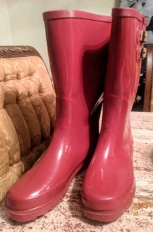 Hello there! I have for sale these beautiful Chooka rain boots, size 10. These boots were made to keep you dry. Heel measures 1 1/8 inches in height, shaft measures 12 1/2 inches in height. They have two straps with pewter adjustable buckles, waterproof moisture absorbing cotton lining, cushioned removable insole, and rubber non-skid outer soles. Crimson Chooka Shoes Winter & Rain Boots. Thank you for your interest and check out my other listings! Have a great day!