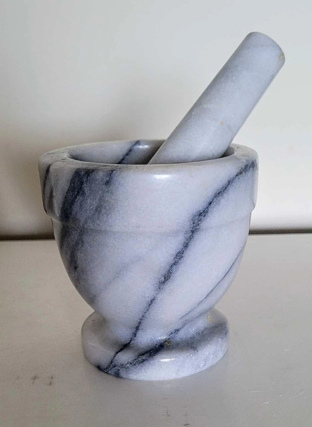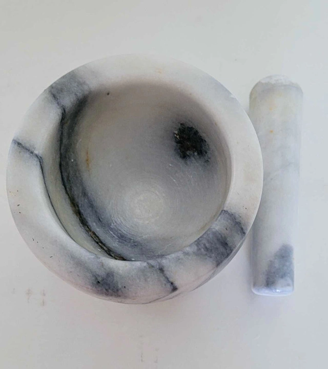 This is a beautiful marble mortar and pestle set, perfect for grinding herbs and spices in your kitchen. The set has some signs of use, which adds to its character. Additional details: * Material: Marble * Colour: White with grey veining * Dimensions: Mortar is approximately 4 inches in diameter; pestle is approximately 6 inches long If the ad is up, it's available!