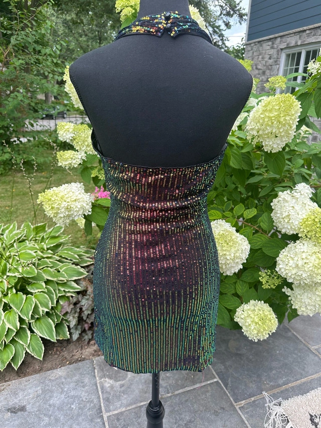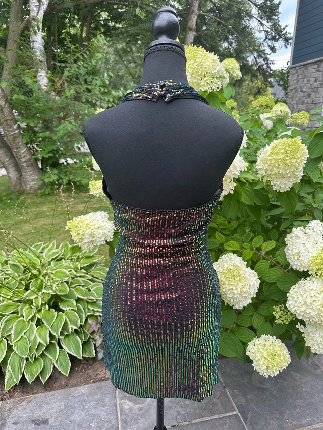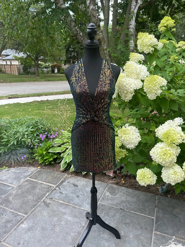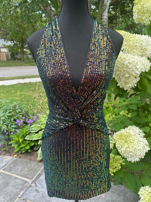 Shine bright in this dazzling NBD sequin mini dress! Perfect for a night out, this dress features a halter neckline, a flattering twist-front design, and a bodycon fit that shows off your curves. It’s brand new and ready to turn heads. * Halter Neckline * Sequin Embellishments * Twist-Front Detail * Bodycon Silhouette * Mini Length Looking at similar dresses, a fair price range for this item is between $40 and $70 CAD. I've priced it at $65 CAD. If the ad is up, it’s still available. Don't miss out on this sparkling gem!