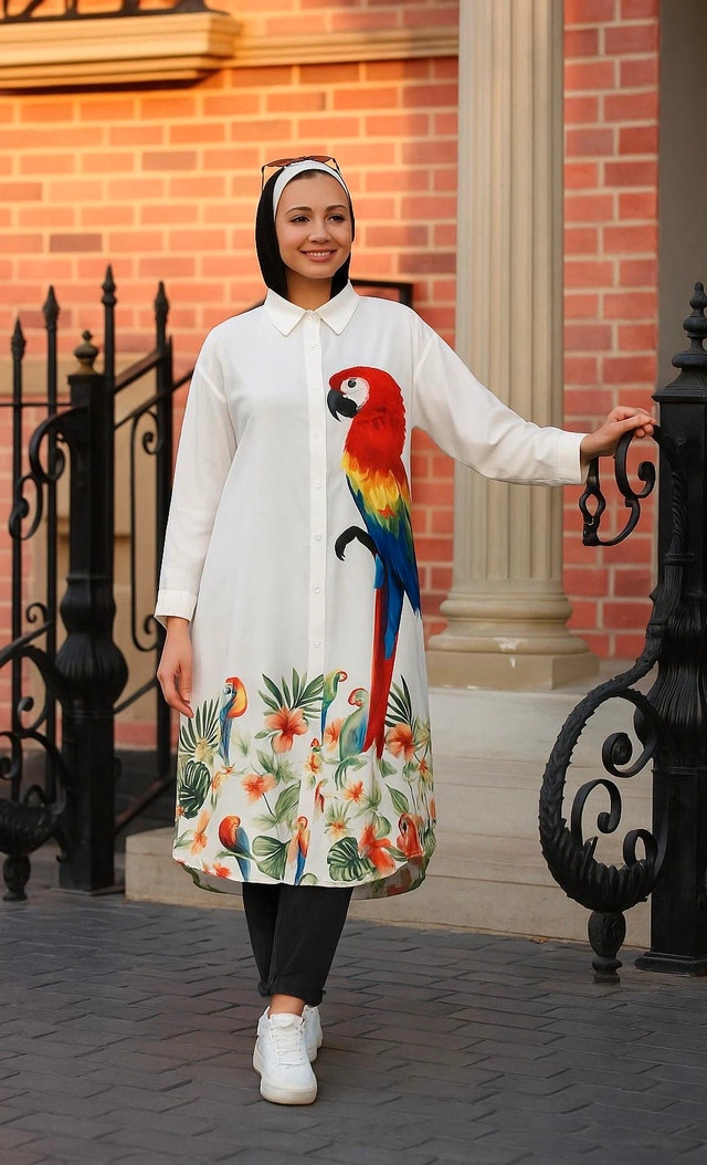 Add a splash of colour to your wardrobe with this vibrant parrot print tunic! It's brand new and features a button-down front and a playful parrot and floral design. This tunic is perfect for adding a unique touch to any outfit. * Long sleeves * Button-down front * Vibrant parrot