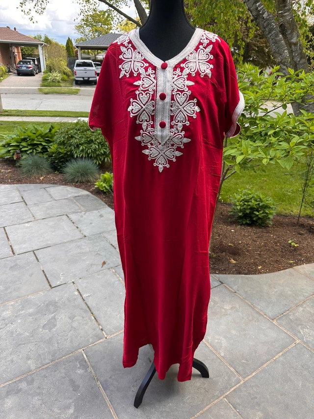 This is a brand new red Moroccan-style caftan with intricate white embroidery, perfect for adding an elegant touch to your wardrobe. Features: - Colour: Red with white embroidery and more colors available - Style: Moroccan Caftan - Fabric: Lightweight, breathable material - Size: all sizes available Condition: New Size: Large (12-14) For Sale By: Owner Cash accepted: Yes Payment: Cash accepted