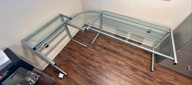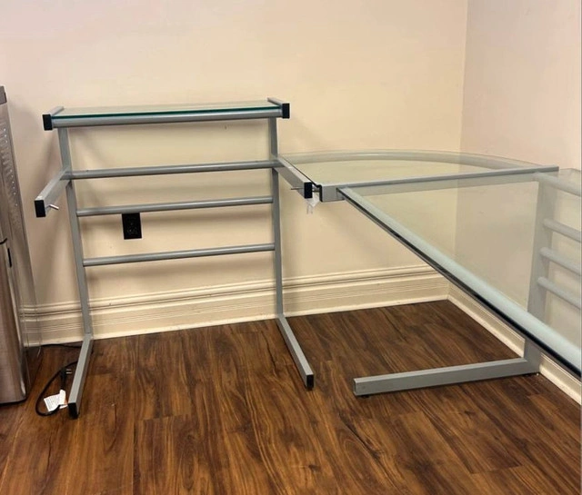 This corner desk features a sleek glass top and a sturdy silver frame, perfect for a home office or study area; it's in used condition. The desk offers ample workspace and includes a convenient shelf for additional storage. Key Features: * Glass top * Corner design * Silver frame * Additional shelf This used corner desk is priced at $120, reflecting its condition and market value. Similar desks are typically listed on Kijiji for between $100 and $150. Act fast—if you're reading this, the desk is still available!