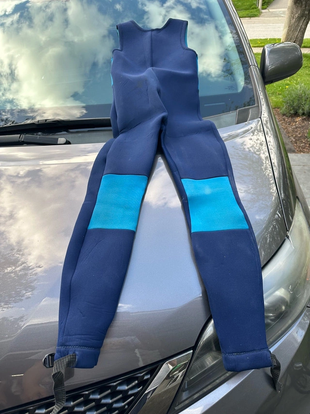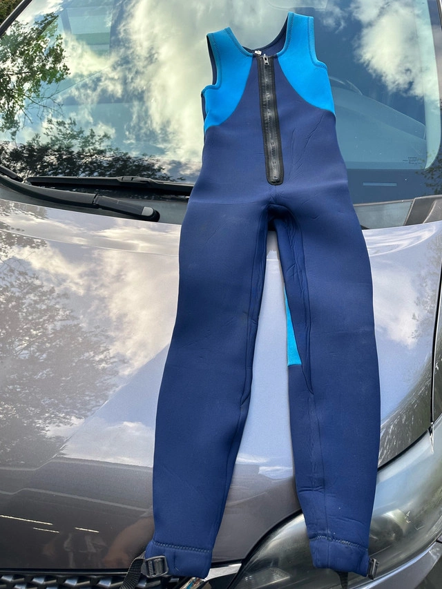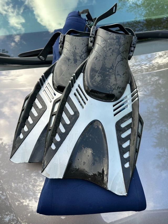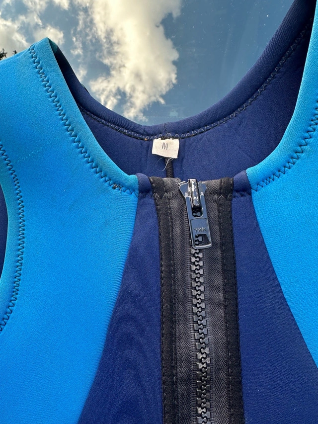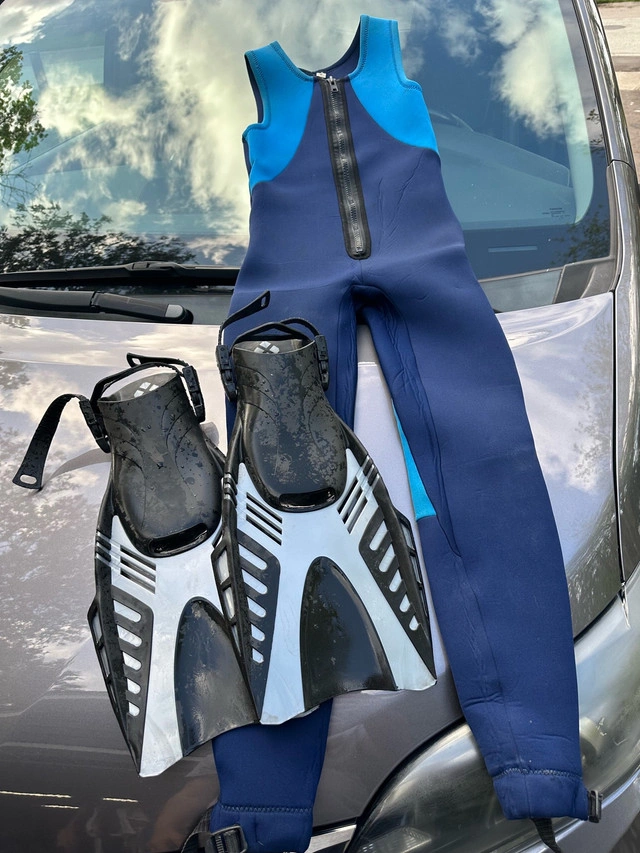 Get ready to make a splash with this used but still functional wetsuit, perfect for your aquatic adventures! This set includes a size M blue and black wetsuit and a pair of black, white and blue fins. Please note that this wetsuit has been previously enjoyed and shows signs of wear, but it's ready to dive into new experiences with you. Here are some additional details: * Wetsuit Size: M * Colour: Blue and Black Be sure to grab this cool wetsuit and fins. Similar wetsuits sell for between $40 and $90 on Kijiji. Since this set is in good condition, I have priced it at $75. If the ad is still up, you bet your bottom dollar it's still available!