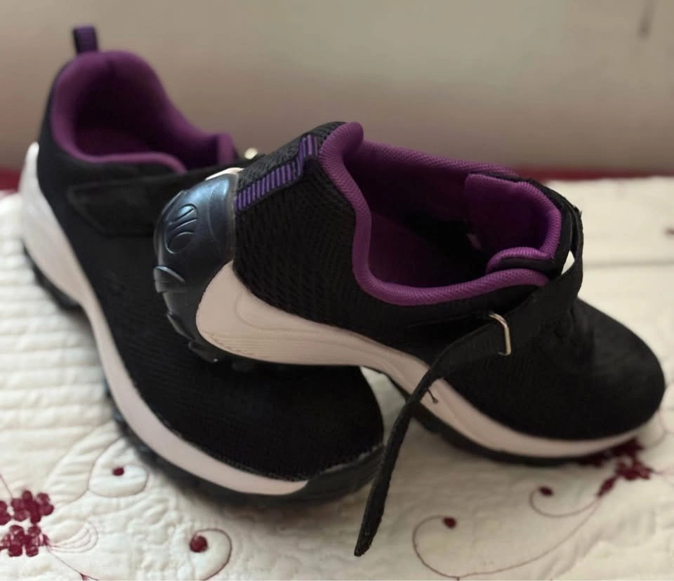 Fashion shoe upper black with strap closure lilac color edge &inside & white mid lower black sole
