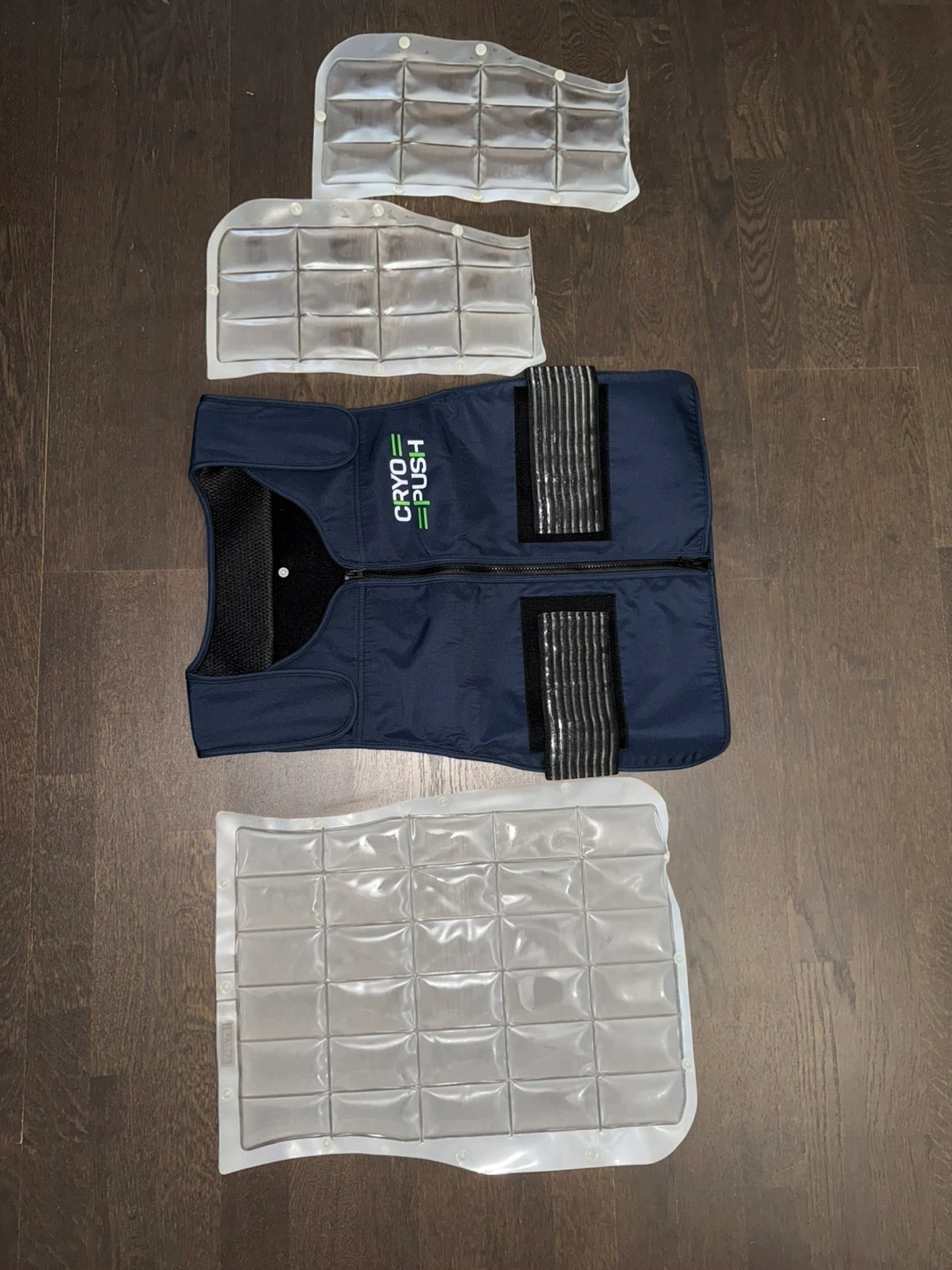 Selling a Cryo-Push cold therapy vest with ice packs. This is great for post-workout recovery or managing pain and swelling. It includes the vest and several ice packs to provide targeted cooling where you need it most