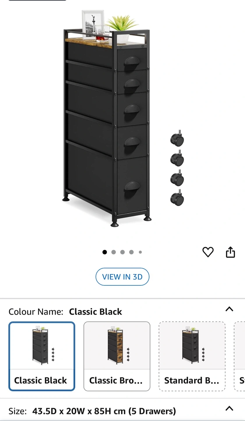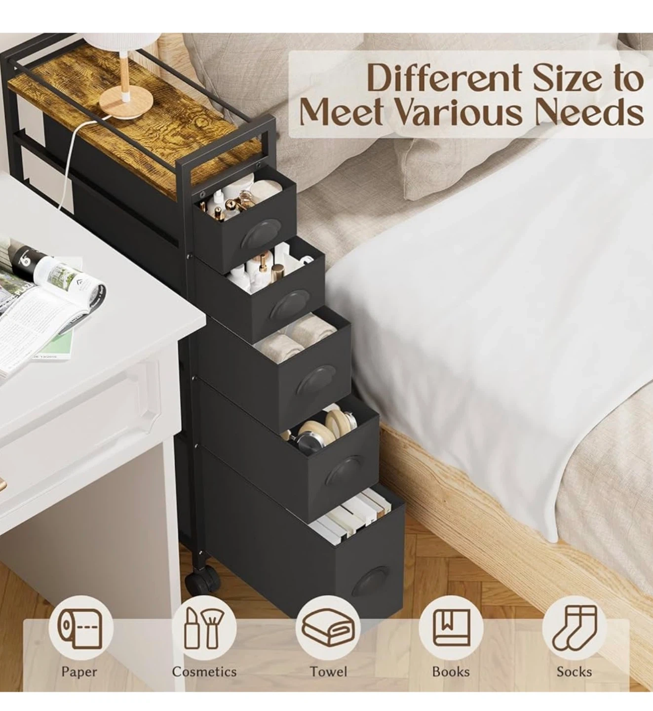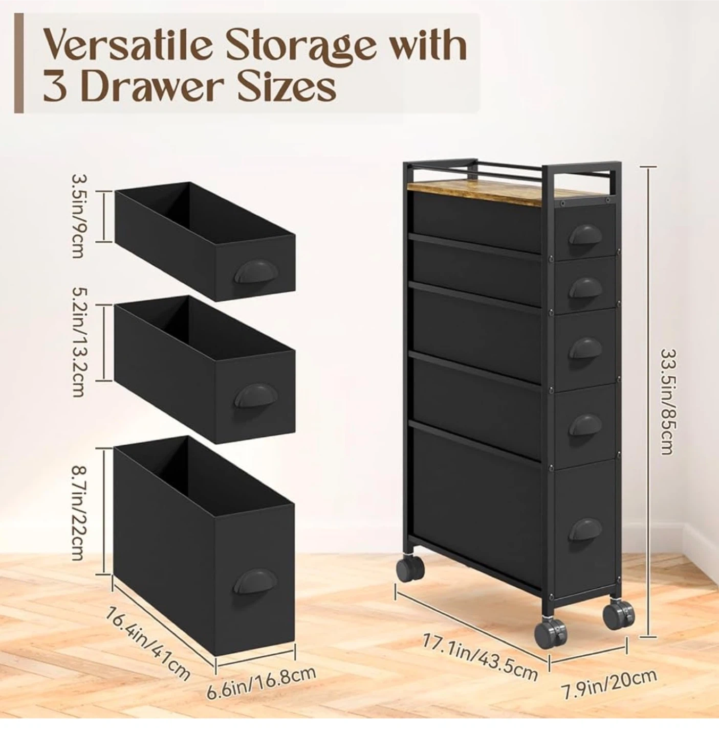 This narrow rolling cart is perfect for adding extra storage to any room! It features 5 drawers and a wooden tabletop for a stylish touch. The dimensions are 43.5D x 20W x 85H cm, making it ideal for tight spaces. The drawers come in three sizes to meet various storage needs. It's great for organizing cosmetics, towels, books, socks, and more