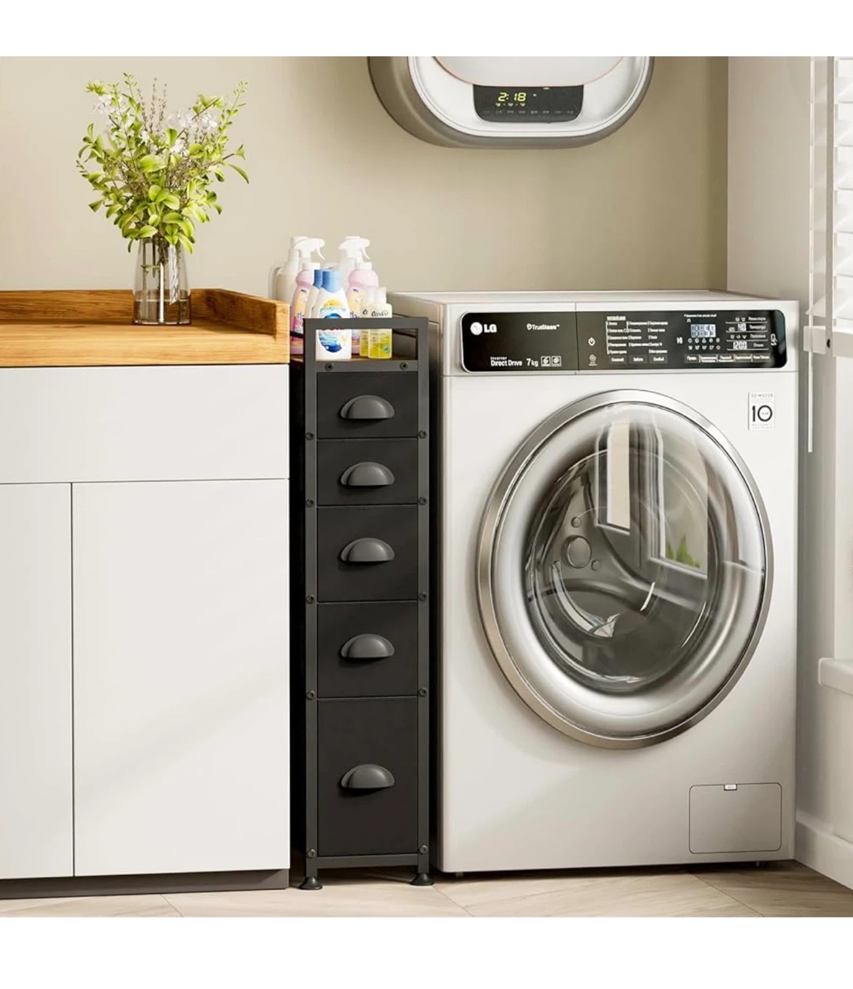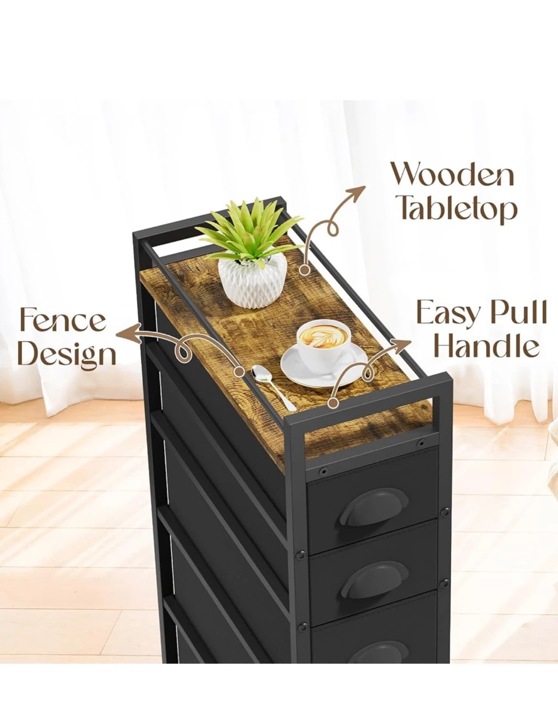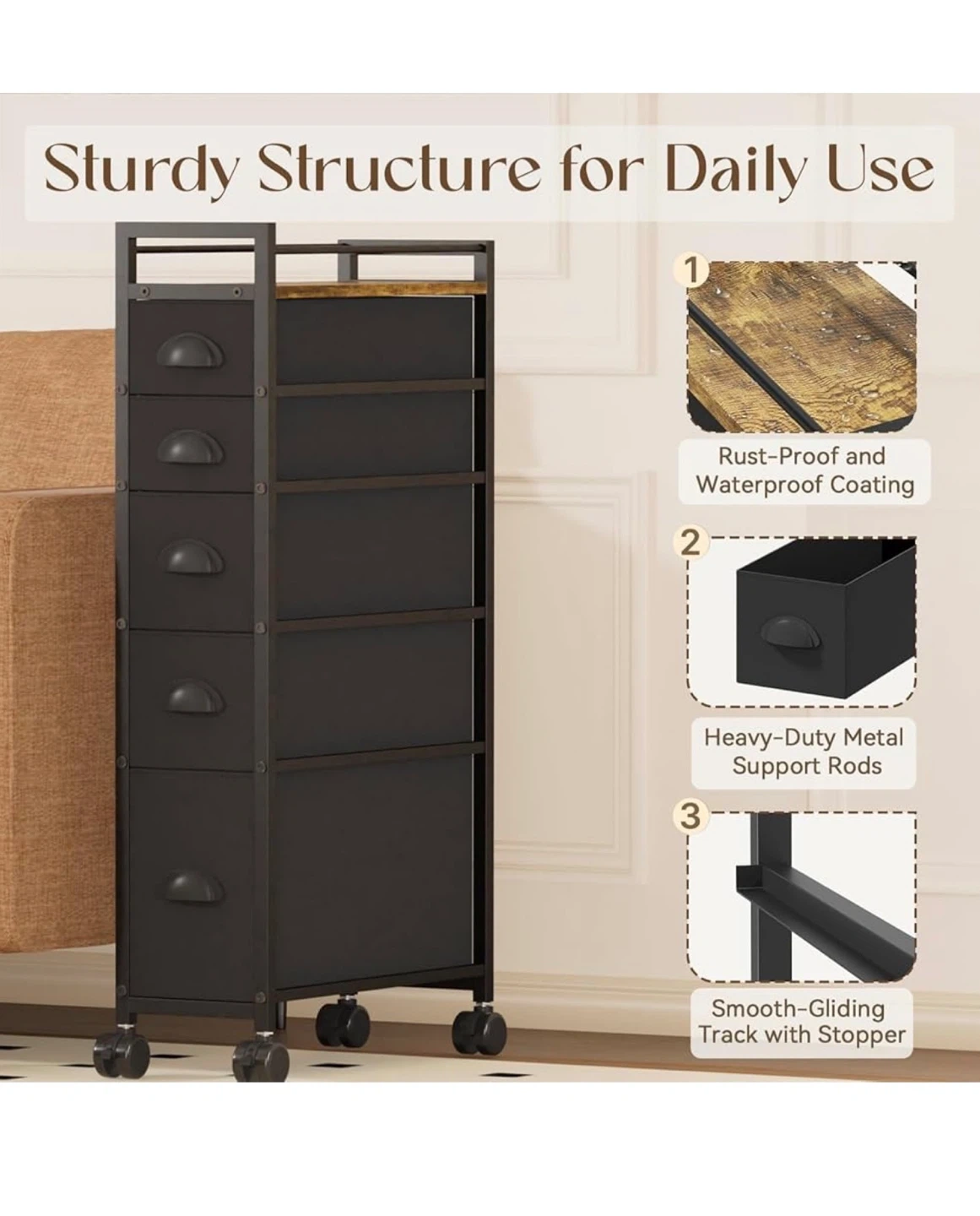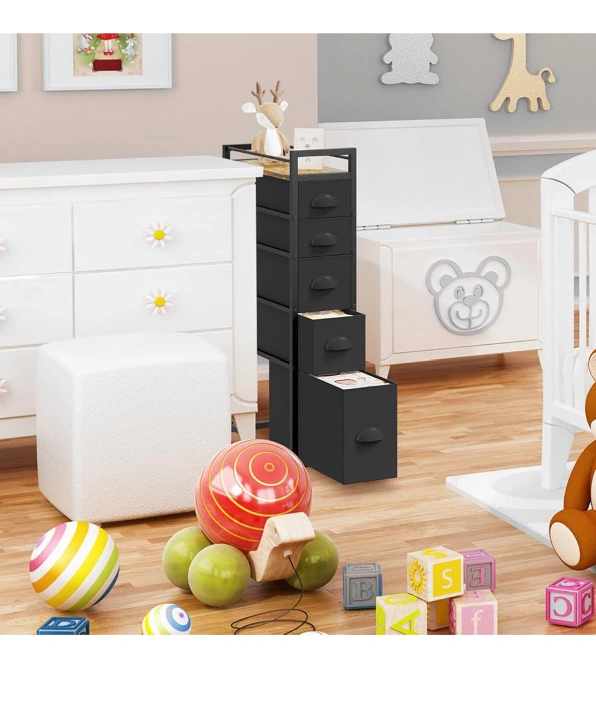 This narrow rolling cart is perfect for adding extra storage to any room! It features 5 drawers and a wooden tabletop for a stylish touch. The dimensions are 43.5D x 20W x 85H cm, making it ideal for tight spaces. The drawers come in three sizes to meet various storage needs. It's great for organizing cosmetics, towels, books, socks, and more