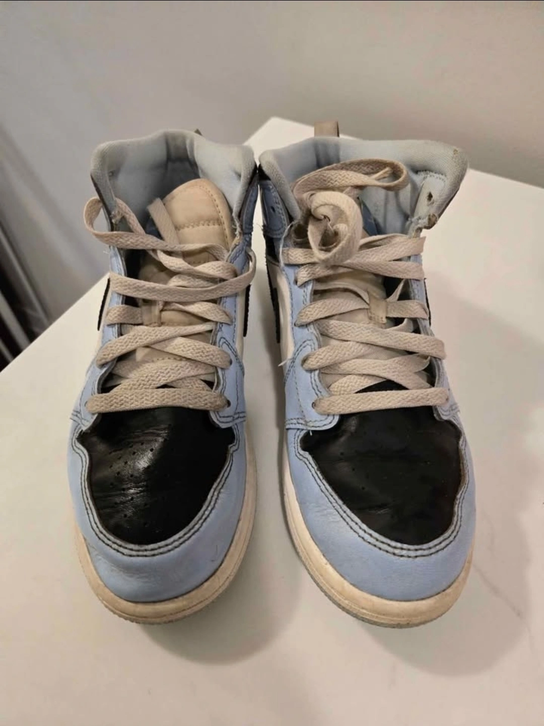 Selling a pair of Jordan 1 Mid sneakers in Ice Blue and Black. They are a size 3Y. Please see photos for condition!