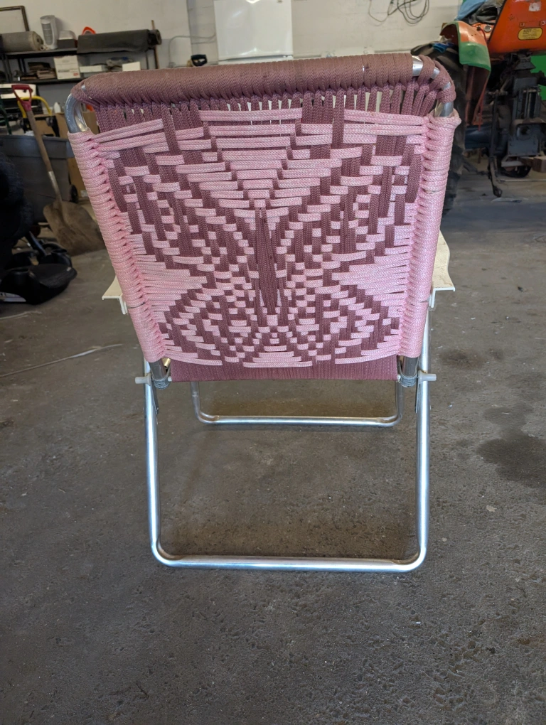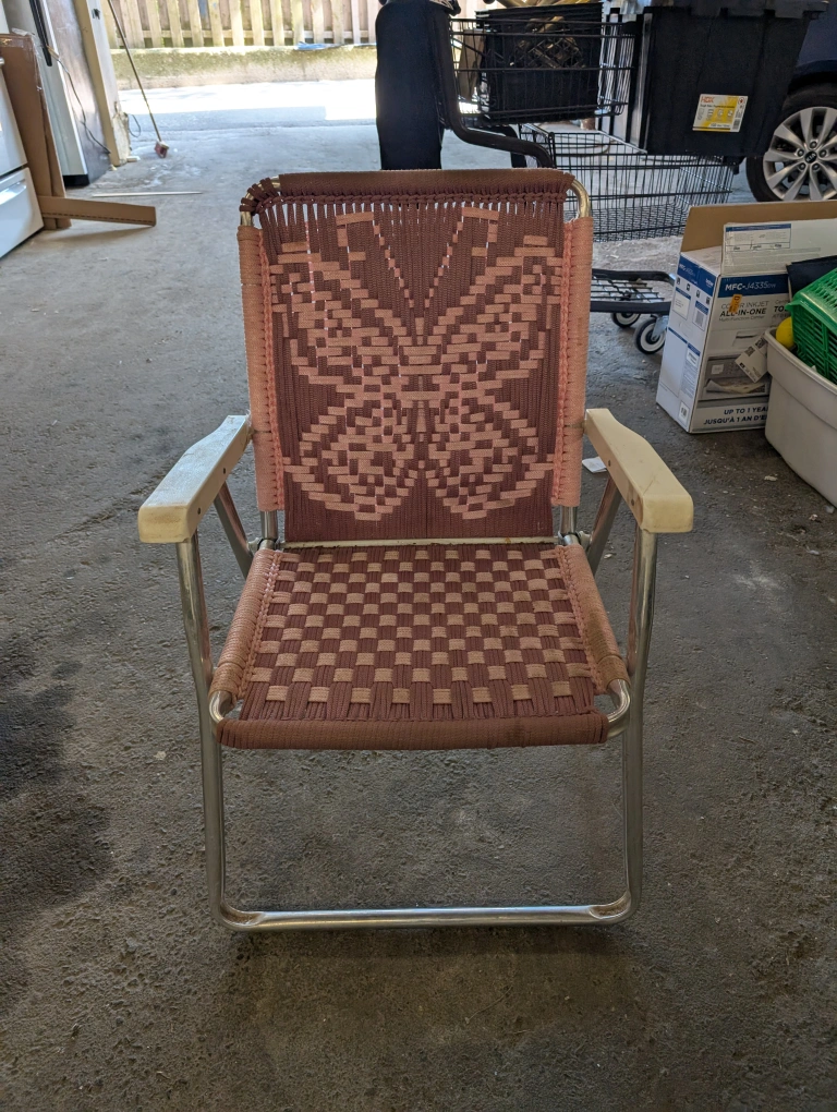 Selling a charming vintage folding lawn chair! It features a unique woven design with a butterfly pattern on the back. The chair is lightweight and easy to fold for storage or transport. Perfect for adding a touch of retro style to your patio or garden