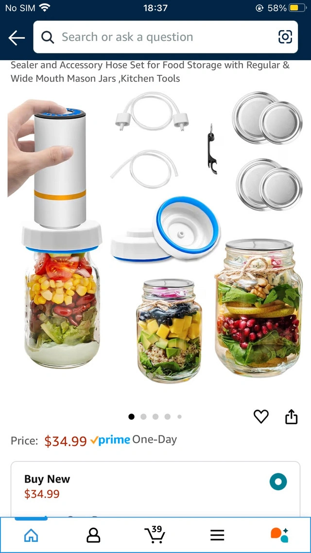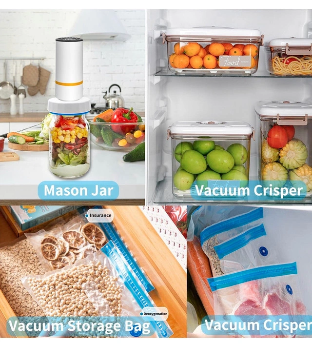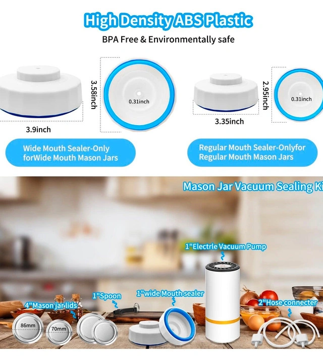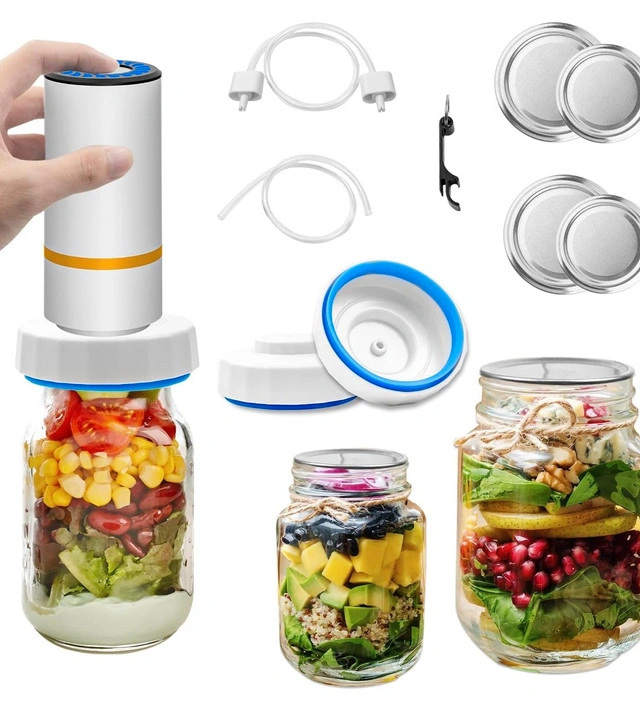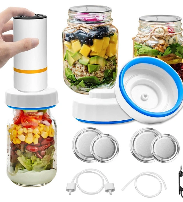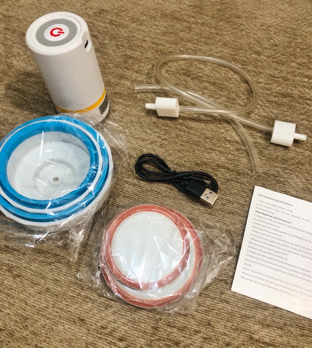 NEW Upmely electric mason jar vacuum sealer kit with accessory hose set for regular & wide mouth mason jars. Great kitchen tool for food storage! Made of ABS plastic and silicone. White. Dimensions: 9.9L x 10.2W x 9.1H cm. 2.5 watts, 5 Volts. It's easy to use and portable. Keeps foods fresh. BPA-free and dishwasher safe. Pick up near 14 Avenue & Markham Road or 500 Esna Park Dr, Markham.