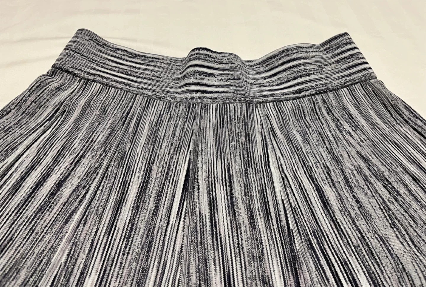 Selling a cute Club Monaco skirt in a grey and white striped pattern. Used, in good condition. Size Medium. Nice weight, has stretch to it. Comfortable elasticated waistband. No hardware (zips/buttons).
