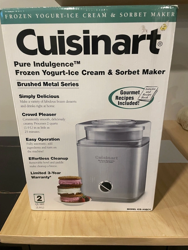 Price reduced! Indulge in homemade delights with the Cuisinart Pure Indulgence Frozen Yogurt-Ice Cream & Sorbet Maker, Brushed Metal Series! This machine delivers up to 2 quarts (1.9 L) of your favorite frozen treats. It's fully automatic, making it easy to add ingredients and enjoy effortless cleanup with its removable bowl and paddle. This is in excellent condition, barely used, and comes with the original box and recipe book. Key Features: * Large 2-Quart (1.9 L) Capacity * Brushed Metal Finish * Easy and Mess-Free * Instruction Book and Recipe Book Included Why not whip up some frozen treats? If the ad is up, it's available!