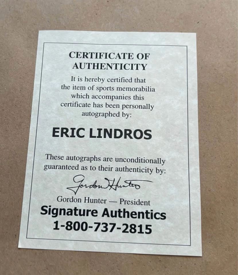 A perfect addition for any hockey fan or memorabilia collector! ✅ Signed by Eric Lindros – NHL legend & Hockey Hall of Famer ✅ Comes with COA – Guaranteed authenticity ✅ Framed & Ready to Display – Great for your home, office, or sports room ✅ Excellent condition Own a piece of hockey history today!