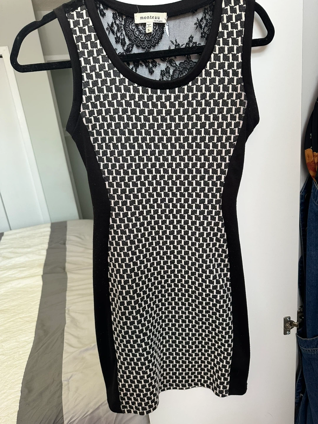 Selling a cute Monteau dress in size small! It features a unique black and white pattern with lace detailing on the upper back. It's in great condition and ready for a new home Pay by cash please