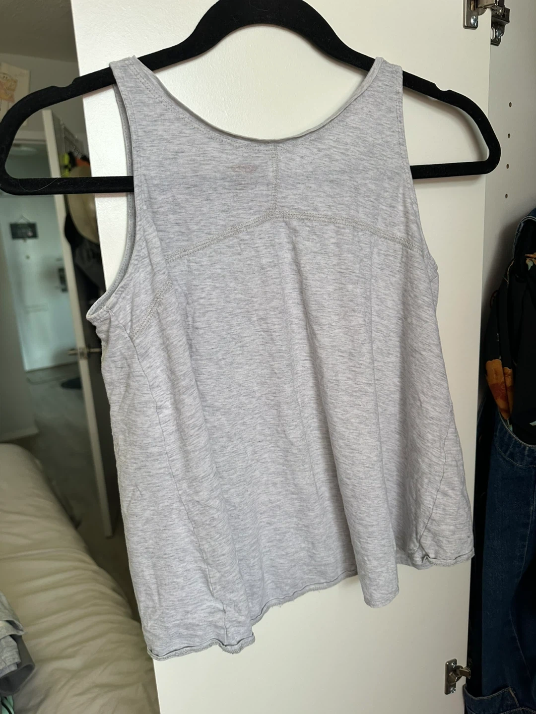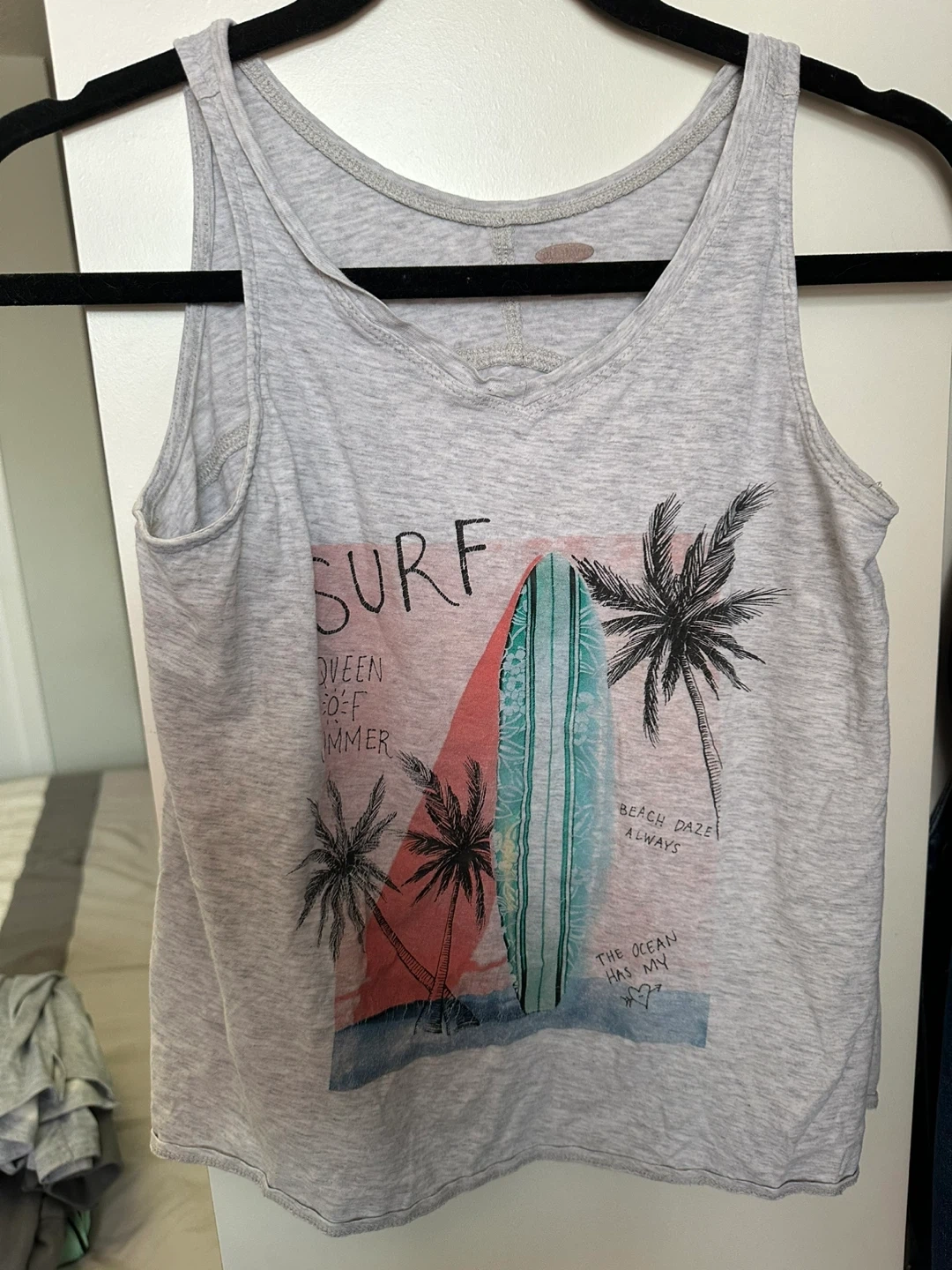 Selling a cute grey tank top from Old Navy! It has a fun surf design on the front with palm trees and a surfboard. It's in great condition and perfect for summer Size:S Pay by cash please