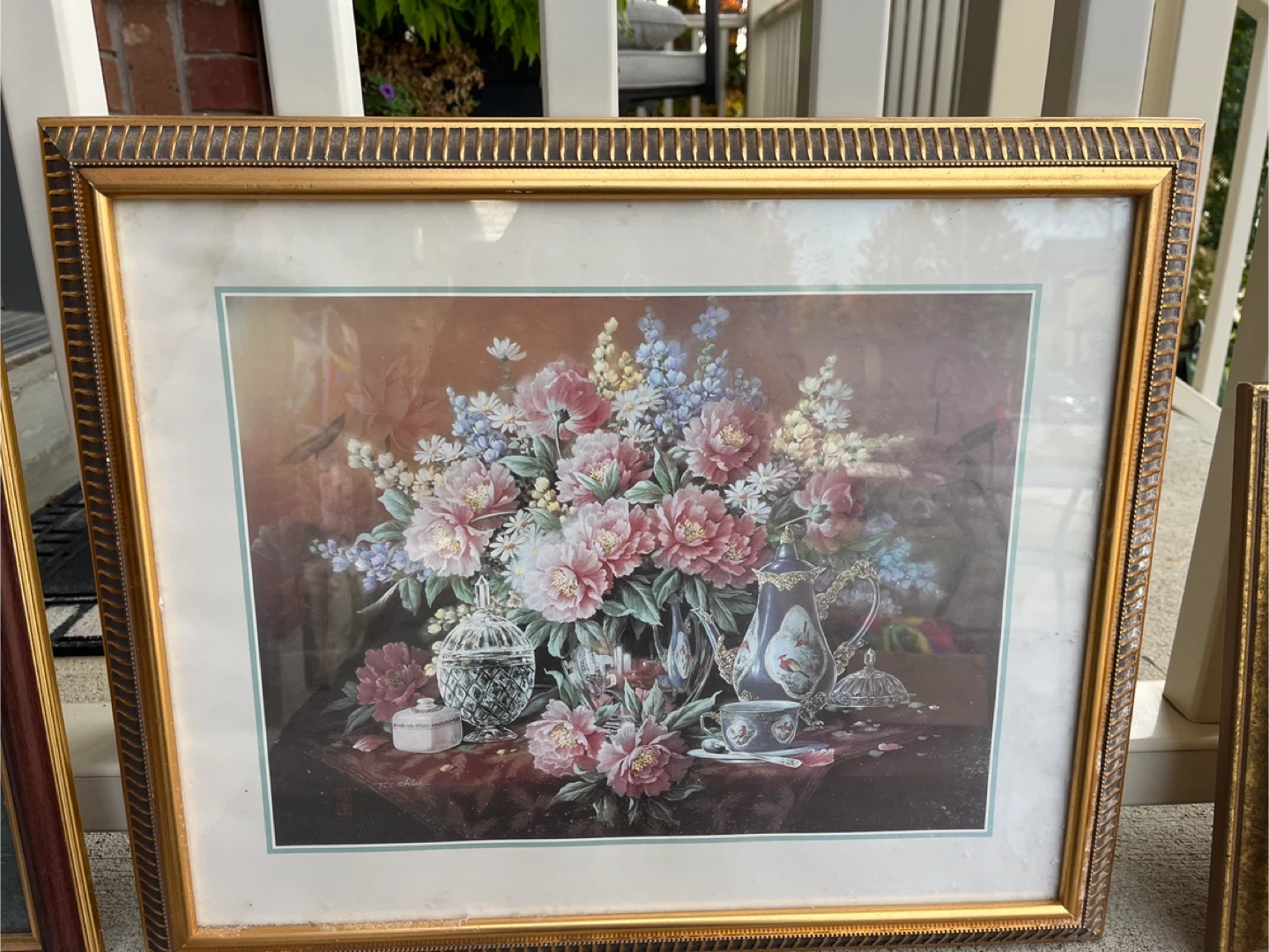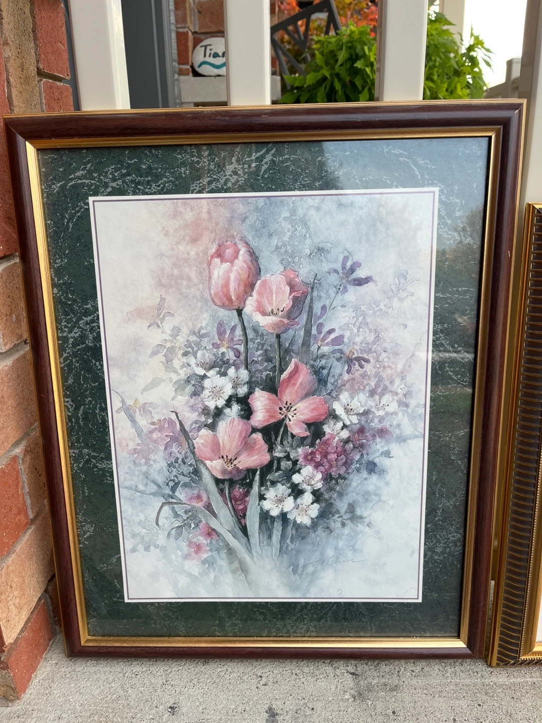 Selling a set of three vintage framed art prints featuring beautiful floral arrangements. They would make a lovely addition to any room!