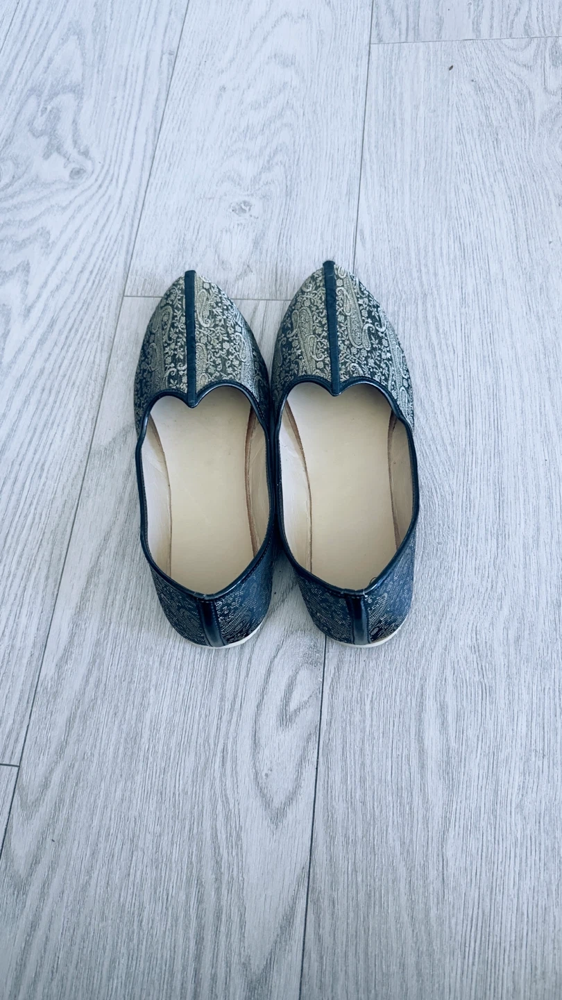 These are a pair of shoes with a unique paisley pattern. They are in good condition and ready for a new home! The shoes feature a slip-on style with a pointed toe.