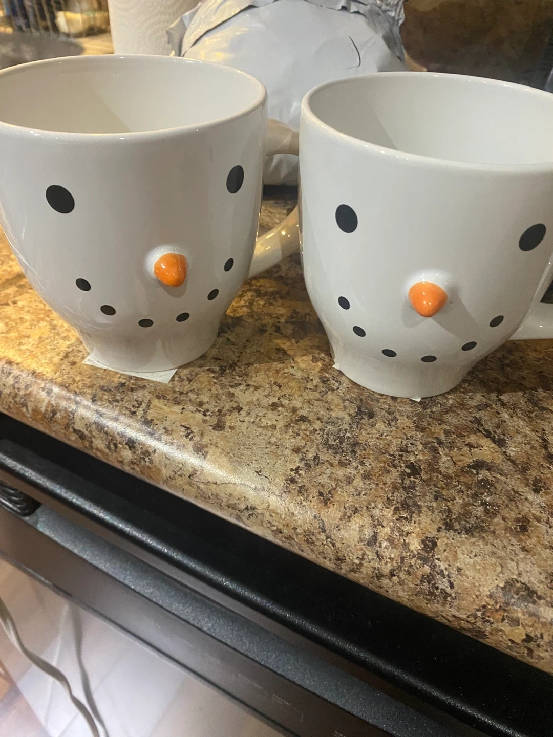 I'm selling a set of two adorable snowman mugs! They're made of ceramic and feature a cute snowman face design with a little orange nose. Perfect for enjoying a warm beverage during the winter months