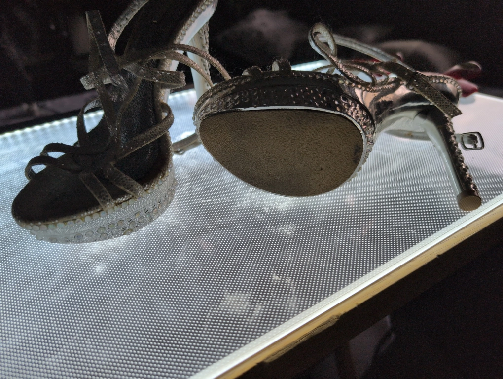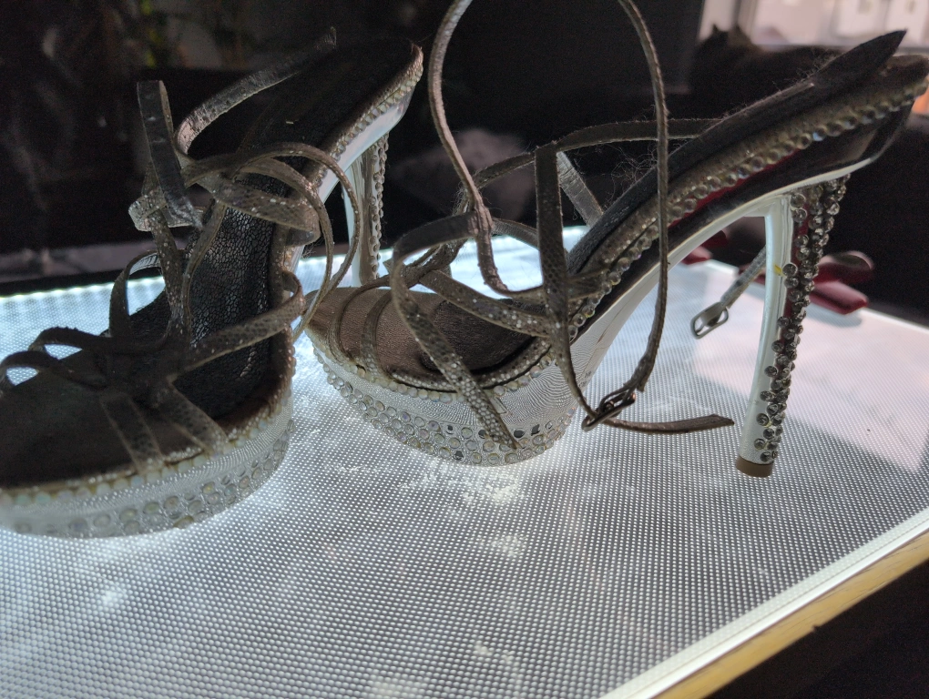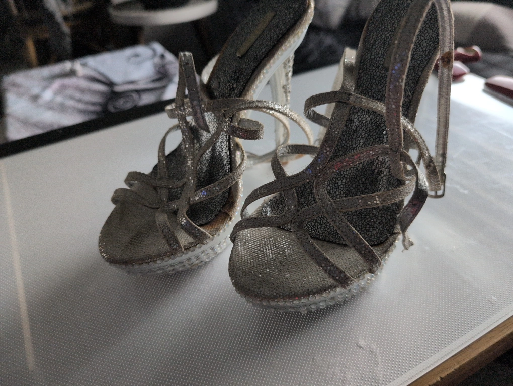 Selling a pair of strappy heels. They are silver and have a decorative heel. Size 6 please see photos for wear and tear