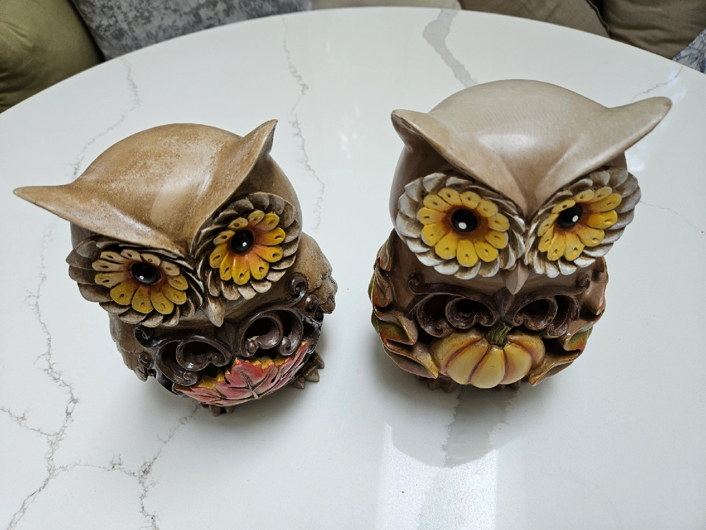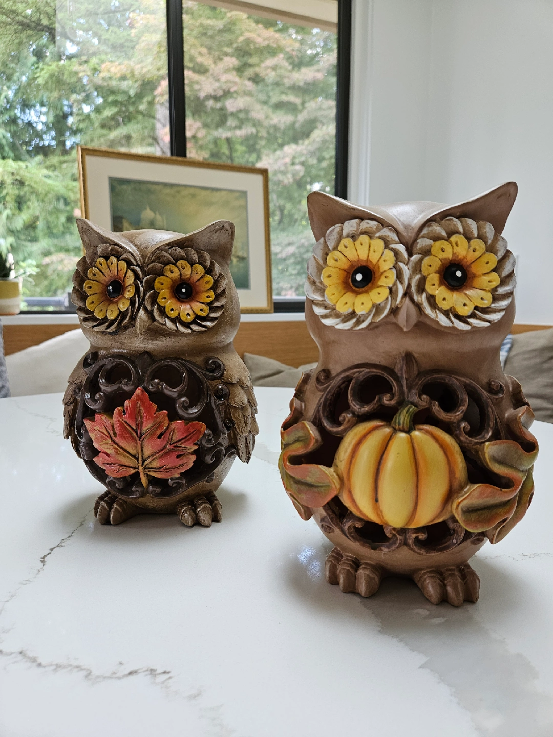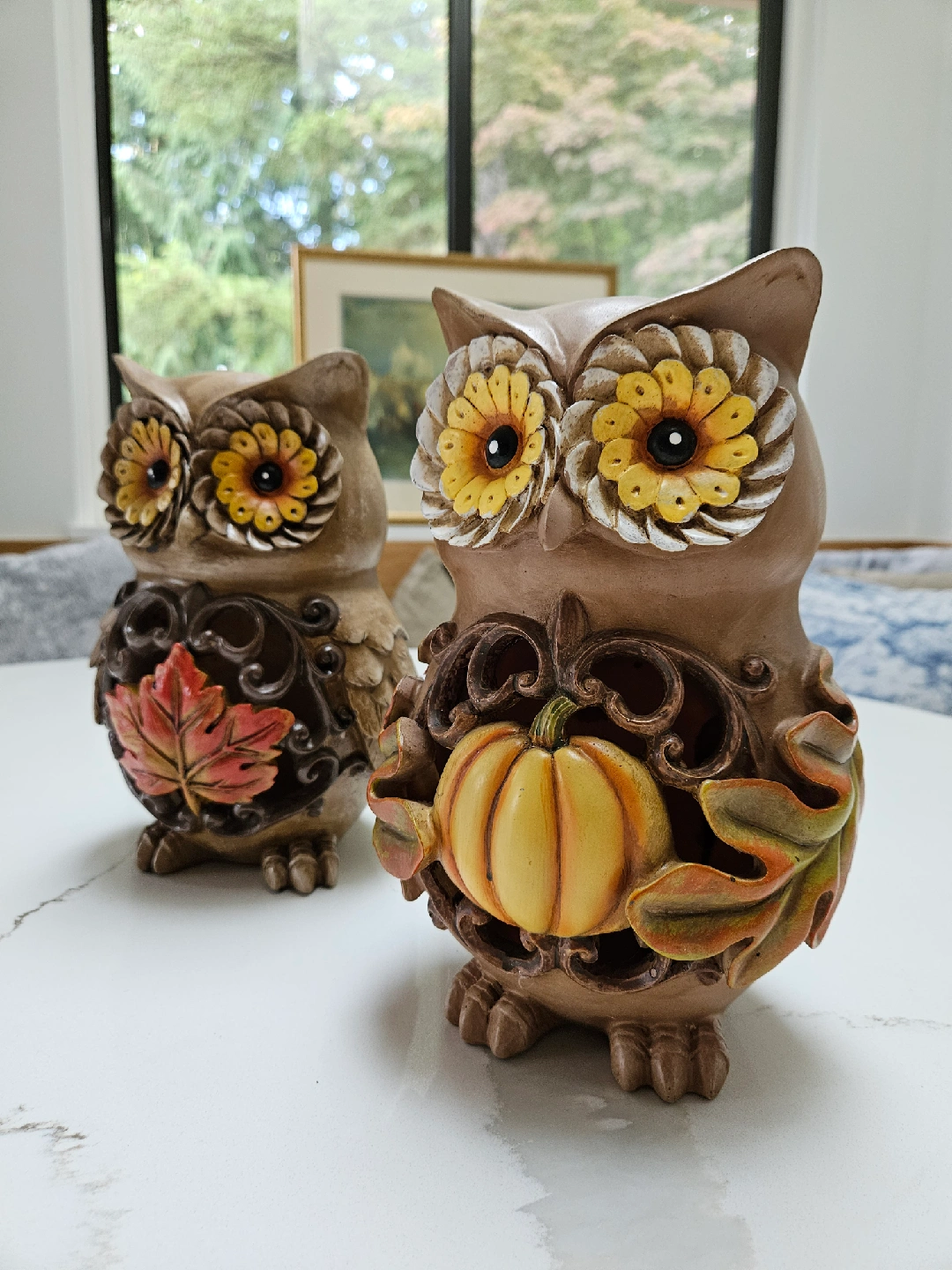 Two adorable owl decorations, perfect for adding a touch of autumn charm to your home! One owl features a vibrant maple leaf, while the other showcases a cute pumpkin design. These are in great condition and ready to brighten up your space for the fall season