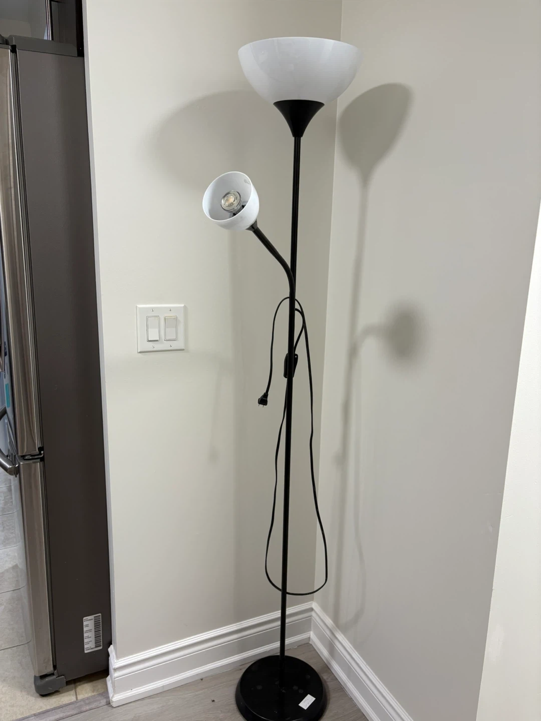Selling a floor lamp in good condition! It features a main upward-facing light and an adjustable reading light on the side. The lamp has a black finish and a fairly study base. It's perfect for adding extra light to any room!
