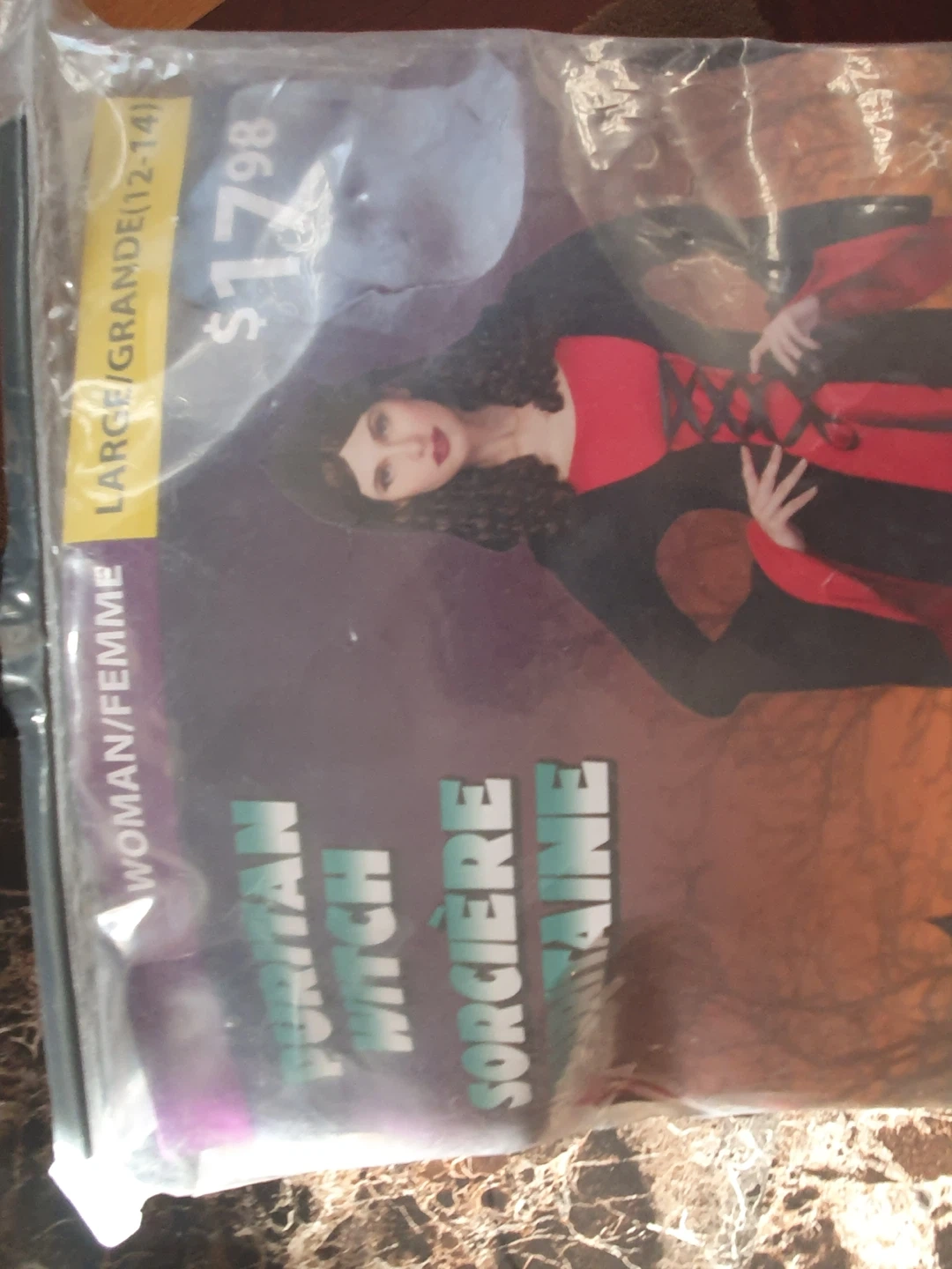 Selling a woman's Puritan Witch costume, size large (12-14). The costume is red and black. Perfect for Halloween!