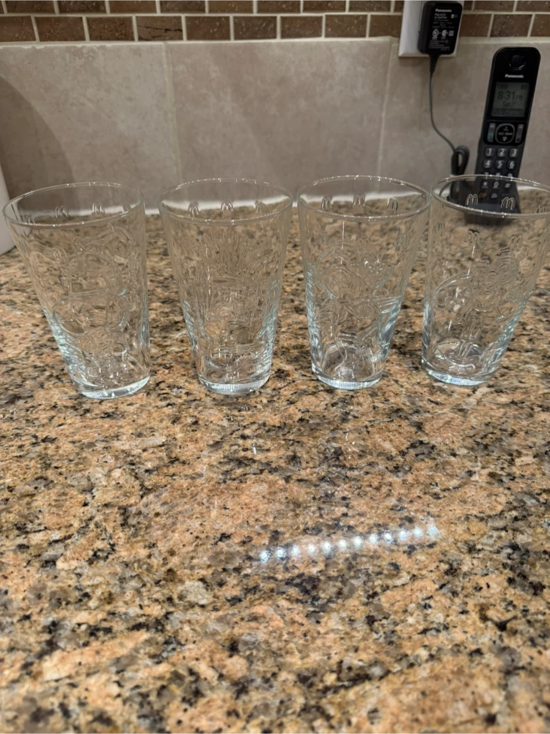 Selling a set of four clear drinking glasses. They have a nice textured pattern and are in great condition. Perfect for everyday use! From McDonald’s