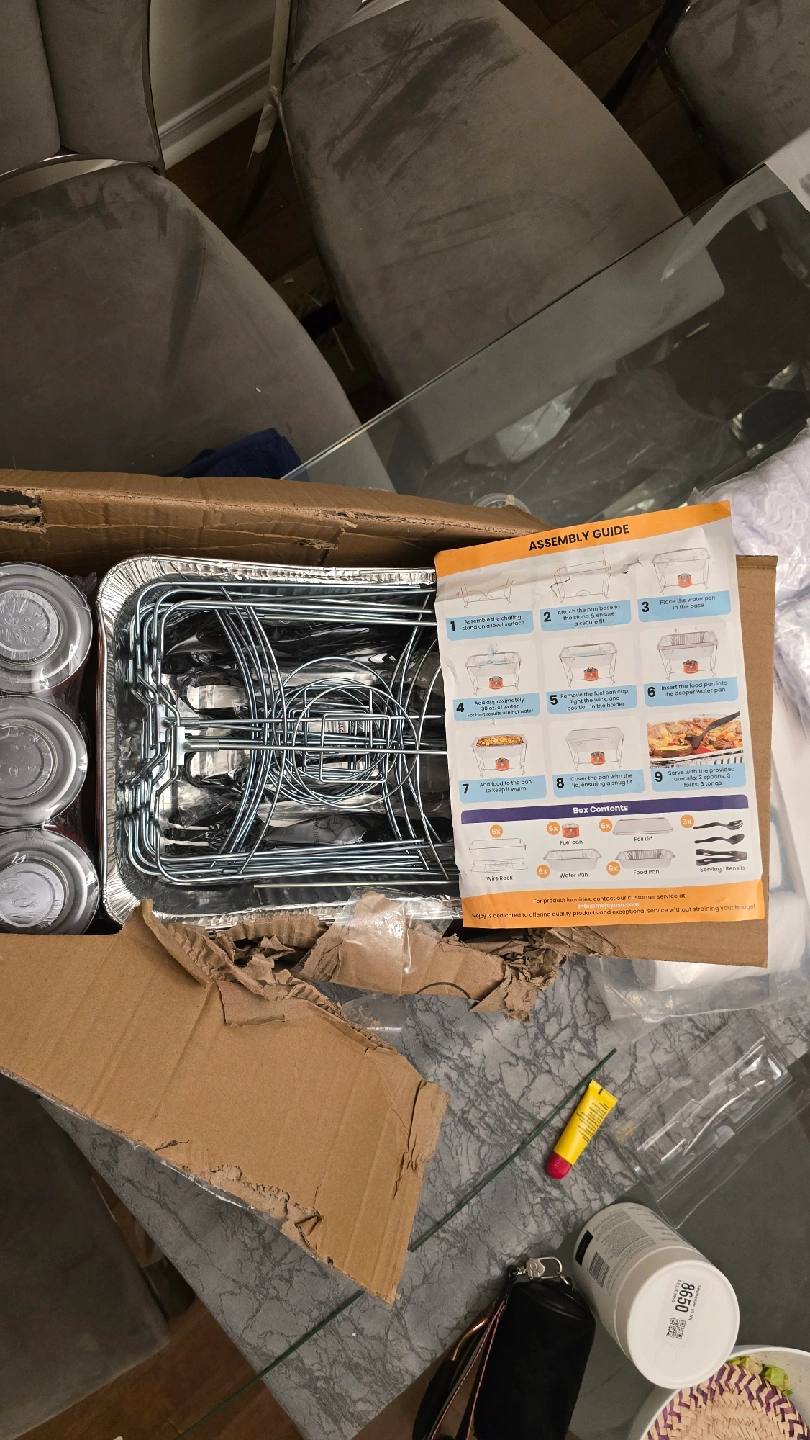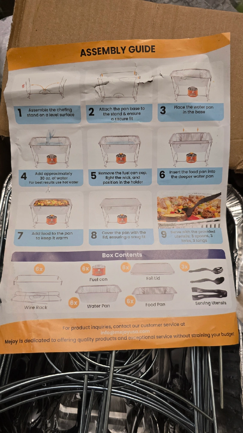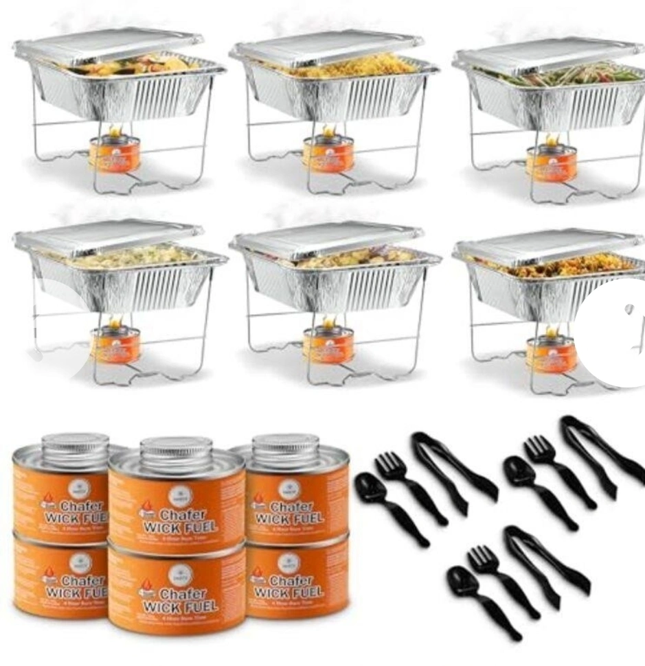 I have a brand new Mejoy Chafing Dishes Set still in its original box! This set includes everything you need for keeping food warm at parties or gatherings. - 6x Wire Racks - 6x Fuel Cans - 6x Foil Lids - 6x Water Pans - 6x Food Pans - 3x Serving Utensils (spoons & tongs) Great for potlucks or any event where you want to keep your dishes at the perfect temperature