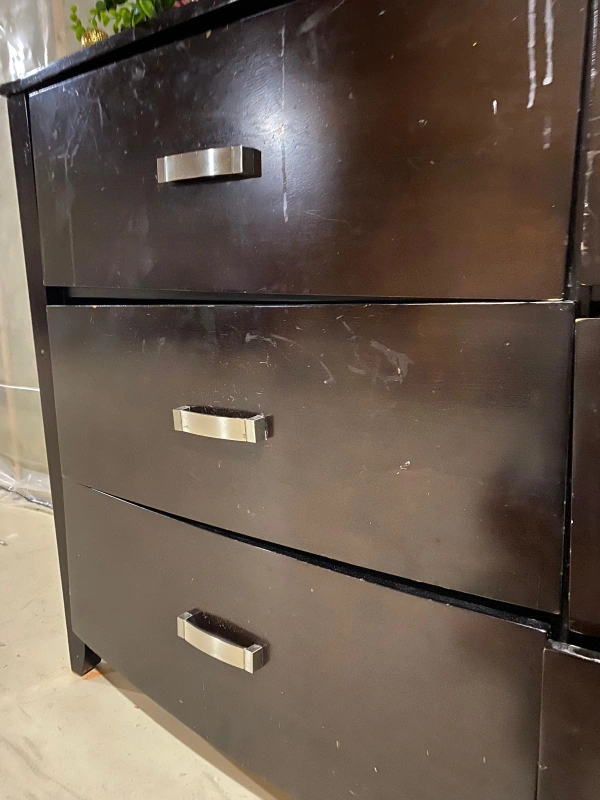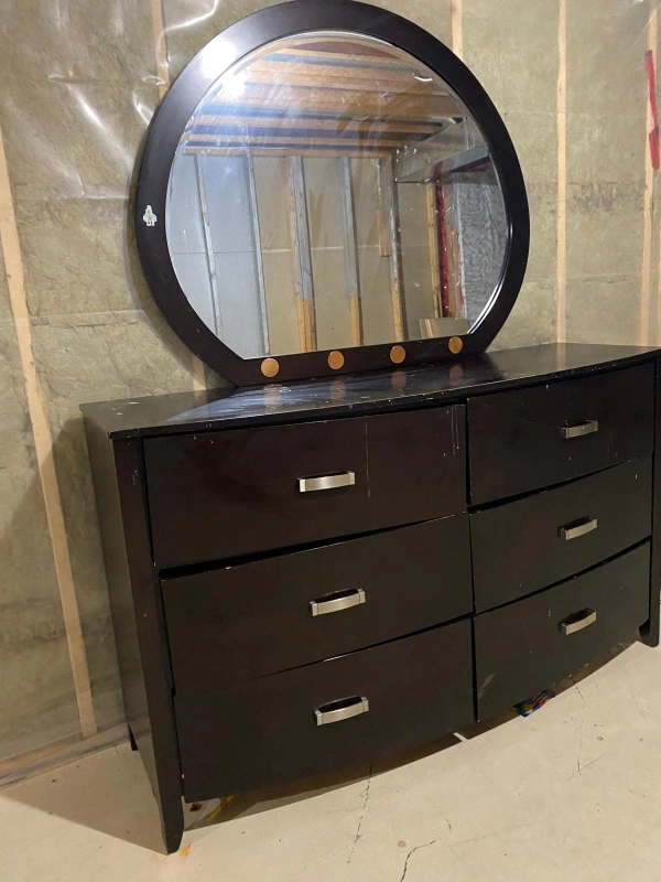 Selling a dark wood dresser, it has a mirror attached. It has some scratches on the surface but is still in good condition