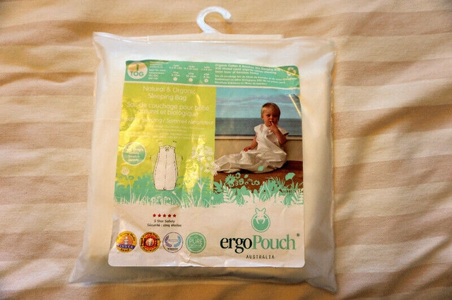 3-6 year (125 cm from shoulder to feet). Brand new - never used or washed. Simple to use: Place child in and zip up. Your child will stay warm all night. Easy 2-way zipper for easy diaper access. Natural & Organic Sleeping Bag. Organic Cotton & Bamboo mix: 300 thread count organic cotton sheeting & inner layer of bamboo fleece. Sleeping with natural fibres creates an optimum temperature balance promotes a healthy sleeping environment. 1 Tog (best for room temperature 18-23 degrees C). Anti-tangle safety stretch inserts. 5 star safety. All of ErgoPouch's fabrics are highly breathable to ensure no overheating occurs. A free room thermometre and what to wear guide comes with each pouch. If you see this ad the item is still available.