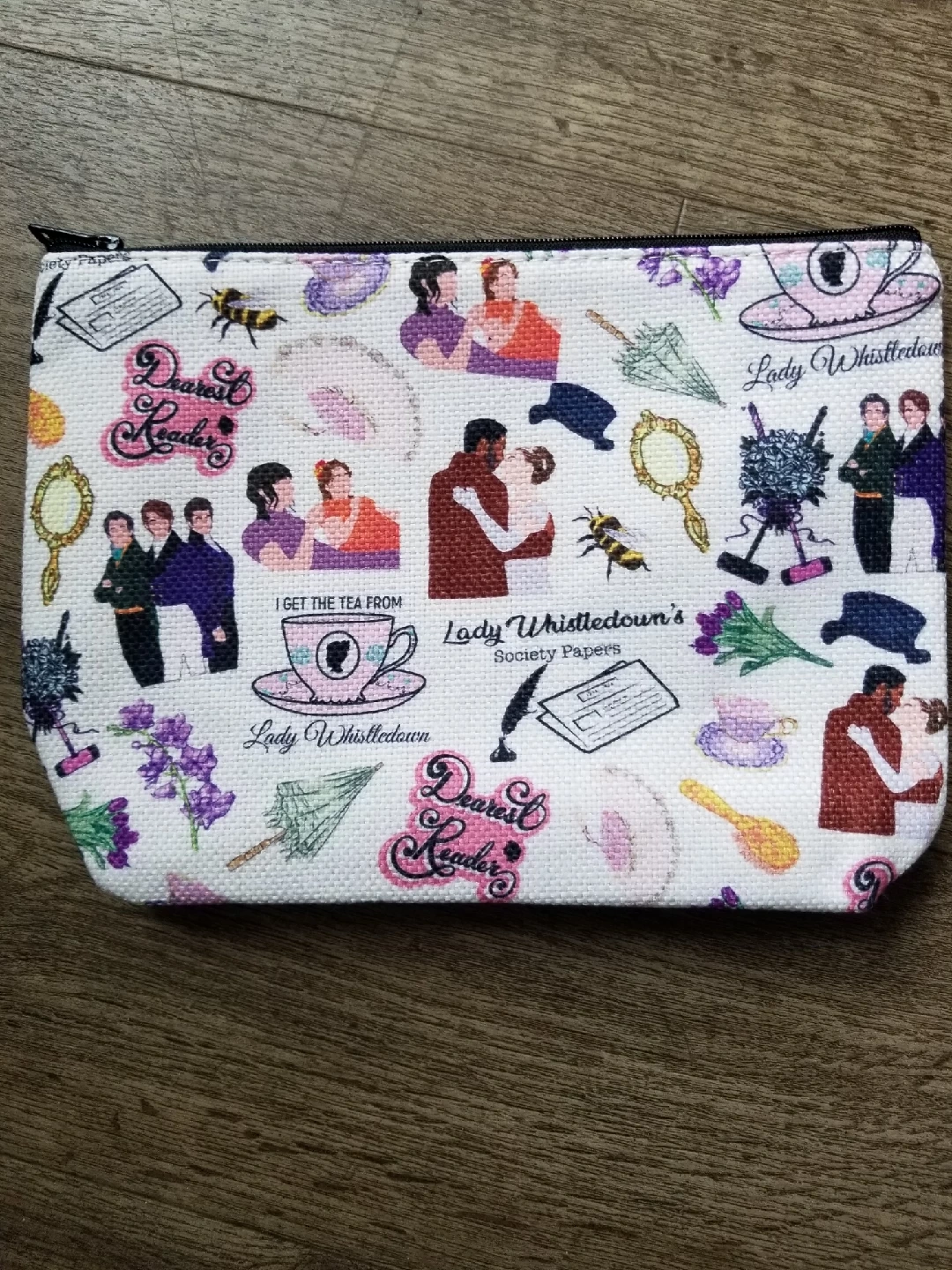 Super cute cosmetic pouch with a Bridgerton theme! It features Lady Whistledown's Society Papers and other fun designs from the show. Brand new